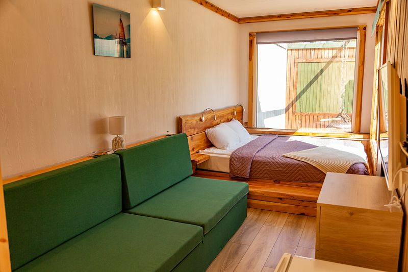 Категория — Люкс. Комфортный, уютный домик с панорамными окнами с видом на лес и открытой террасой. Двуспальная кровать с матрасом Blue Sleep, кондиционер, полноценный санузел с душевой кабиной.