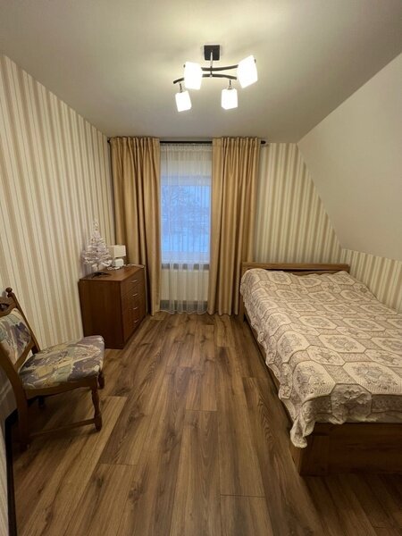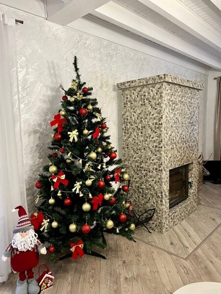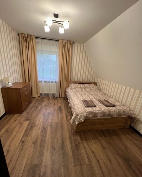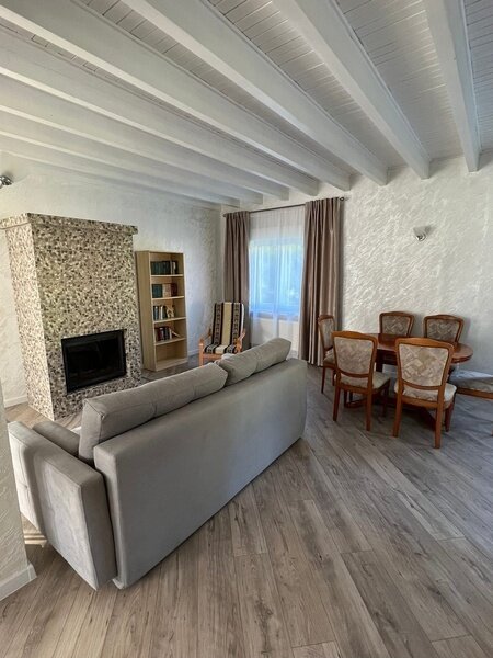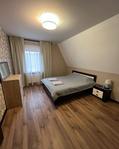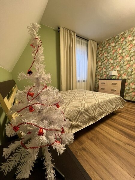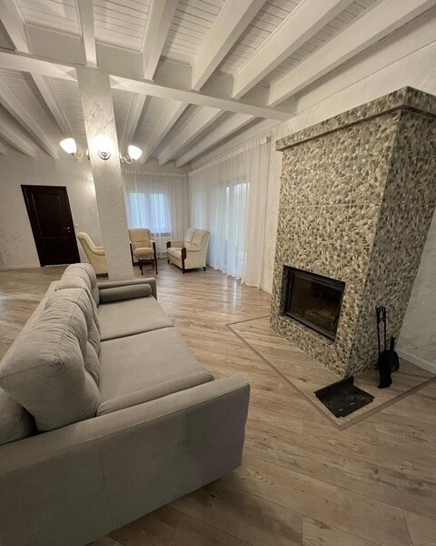На первом этаже гостевого дома посетителей ждет уютная гостиная с камином, где можно приятно провести вечер в кругу близких. Также на этом этаже находится санузел. На втором этаже расположены три уютные спальни и ванная комната.