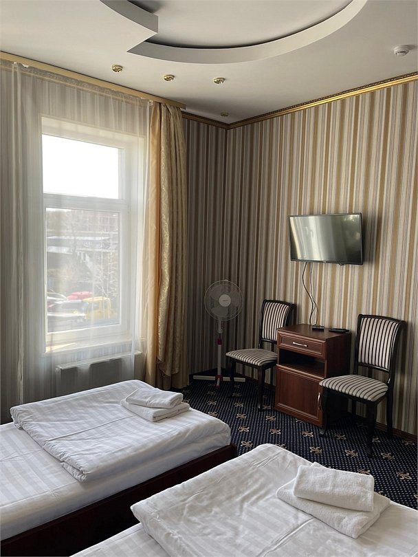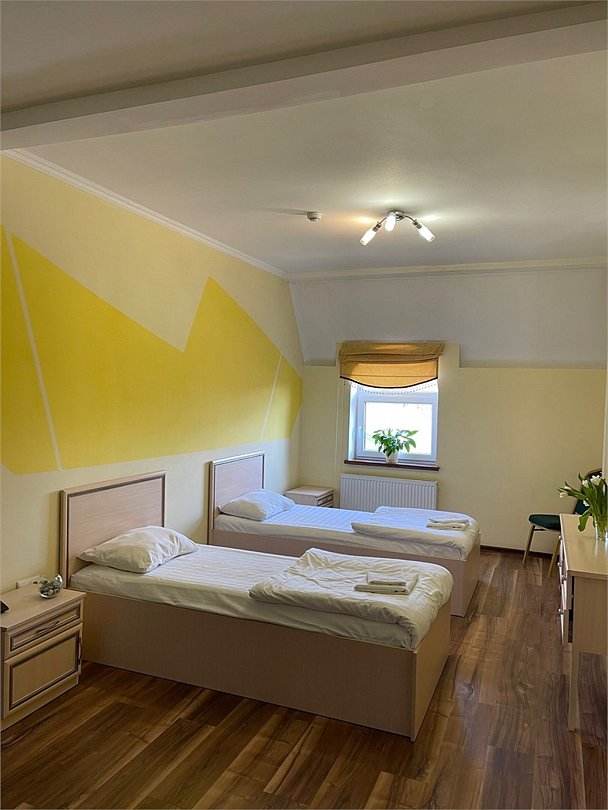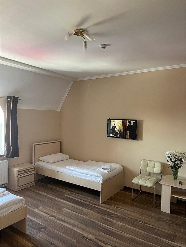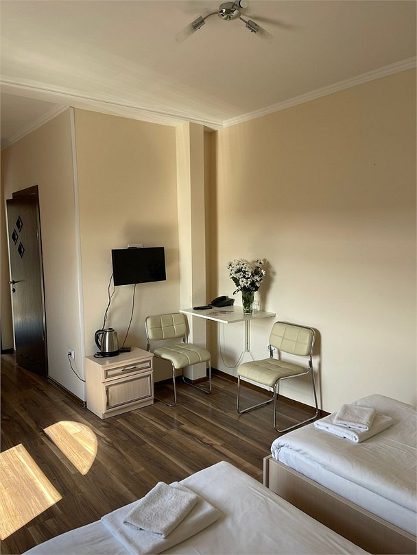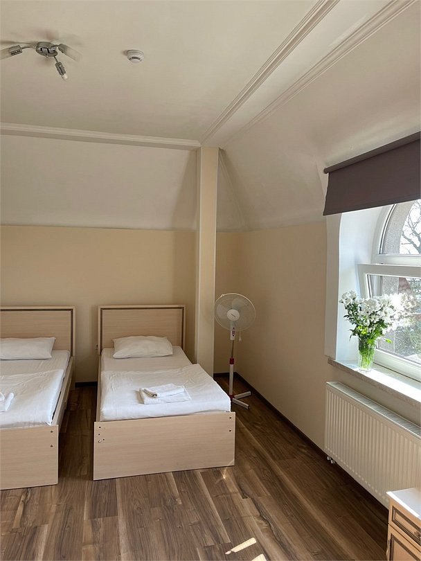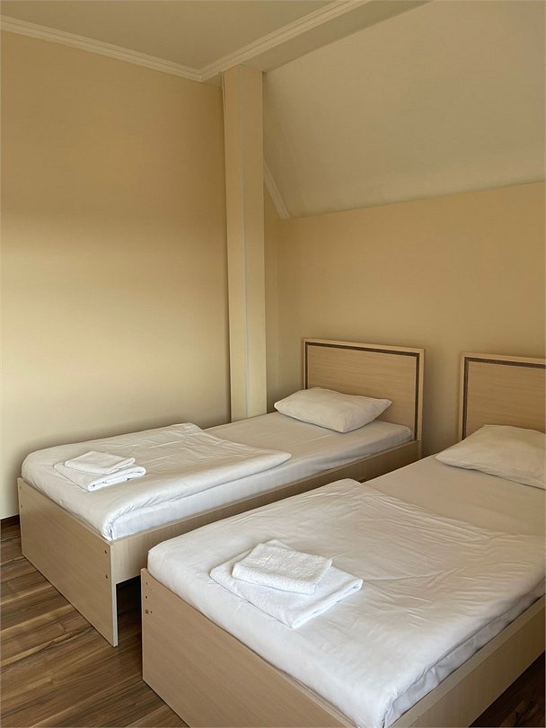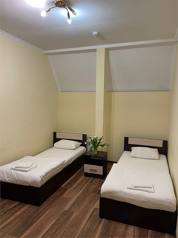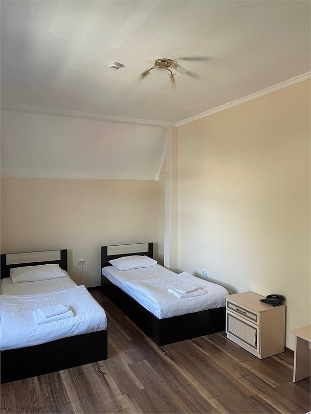 Площадь номера: 22 м2. В номере: две односпальные кровати, шкаф, прикроватные тумбочки, вешалка, вентилятор, телефон, тумбочка, телевизор, Wi-Fi. В ванной: туалет, раковина, душевая кабина, средства личной гигиены, зеркало, набор полотенец.Услуги и удобства