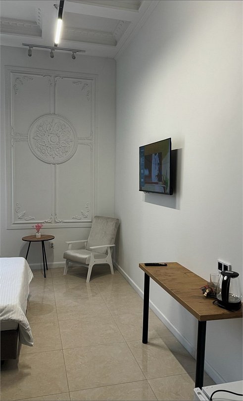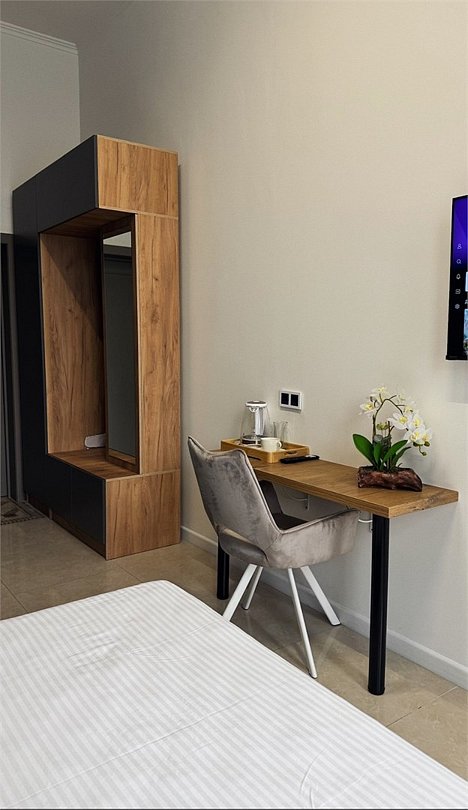 телевизор, Wi-Fi, светильник, фен, вентилятор, электронные замки, ванная комната, душевая кабина, санузел, халаты, банные полотенца, тапочки, косметические средства, двуспальная кровать, шкаф для одежды, вешалки, письменный стол, зеркало, чайный набор, информационная карта, меню, чайник, унитаз, раковина, мягкая мебель, душ, кулер на этаже, плиточное покрытие, кресло, вид во двор, высокие потолки, стаканы, туалетные средства, туалет, внутренний телефон, мини-холодильник, москитная сетка, телевизор со Smart TV, номер для некурящих, фумигатор, уборка номера, набор для приготовления чая и кофе, шапочка для душа, мыло, затемняющая штора, зеркало в полный ростВ гостиничном номере