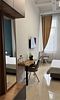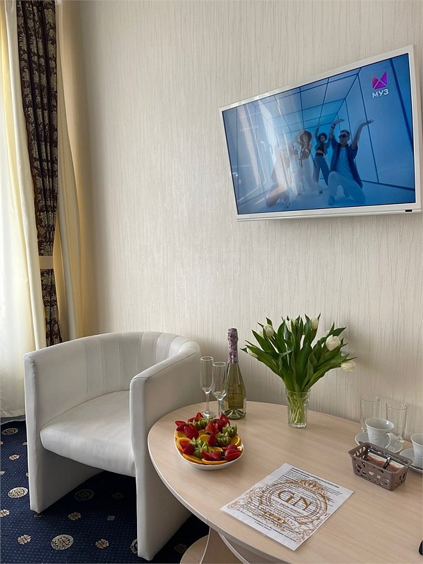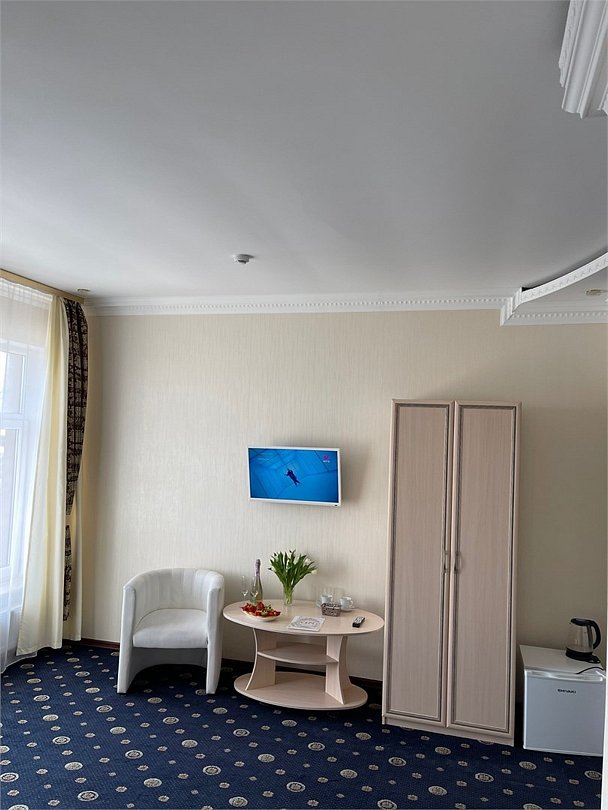 два телевизора, Wi-Fi, телефон, холодильник, светильник, настольные лампы, фен, вентилятор, будильник, утюг, ванная с джакузи, банные полотенца, пляжные полотенца, гигиенические средства, две односпальные или большая двуспальная кровать, гладильная доска, тумбы, стулья, шкаф для одежды, гардеробная, вешалки, журнальный столик, стол для переговоров, обеденный стол, багажная тумба, зеркало, комод, пуфики, ковер, чайный набор, набор посуды, обслуживание номеров, информационная карта, меню, чайник, унитаз, раковина, питьевая вода, гостиная зона, ковровое покрытие, вид на город, три комнаты, креслоВ гостиничном номере