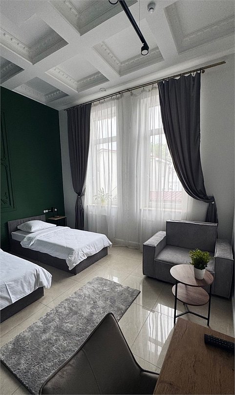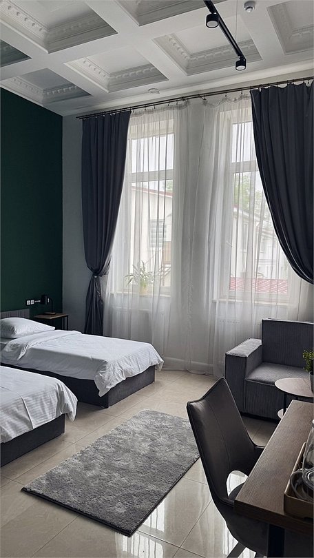 Wi-Fi, светильник, фен, вентилятор, электронные замки, ванная комната, душевая кабина, санузел, халаты, банные полотенца, тапочки, косметические средства, две односпальные кровати, шкаф для одежды, вешалки, письменный стол, зеркало, информационная карта, меню, чайник, унитаз, раковина, кулер на этаже, плиточное покрытие, кресло, вид во двор, высокие потолки, стаканы, туалетные средства, туалет, диван-кровать, внутренний телефон, телевизор с плоским экраном, мини-холодильник, москитная сетка, телевизор со Smart TV, номер для некурящих, фумигатор, уборка номера, набор для приготовления чая и кофе, шапочка для душа, мыло, затемняющая штора, зеркало в полный ростВ гостиничном номере
