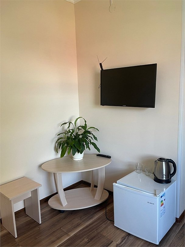 телевизор, Wi-Fi, телефон, светильник, фен, вентилятор, душевая кабина, двуспальная кровать, односпальная кровать, тумбы, стулья, вешалки, журнальный столик, зеркало, пуфики, чайный набор, чайник, кулер на этаже, столВ гостиничном номере