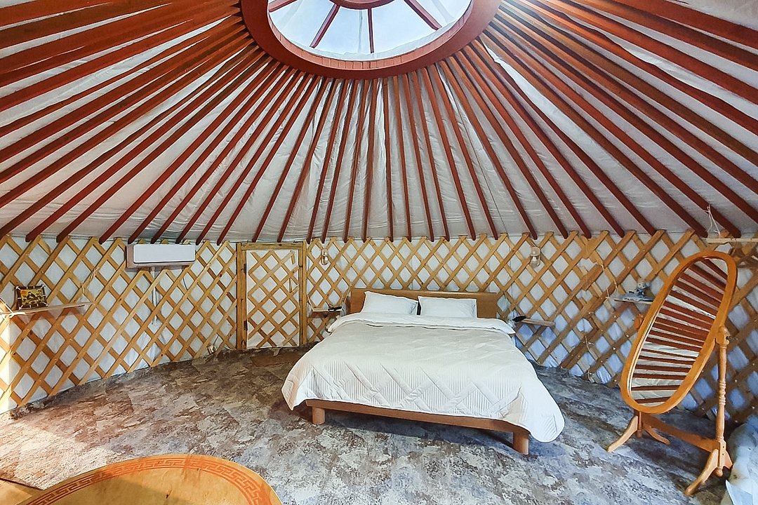 Глэмпинг «Калмыцкий дворик Сансара», словно оазис покоя в сердце тихого пригорода Элисты, приглашает гостей в мир уюта и гармонии. Юрты, окруженные зеленью, становятся не просто местом ночлега, а настоящим домом вдали от городской суеты. В каждой юрте, обставленной с вниманием к деталям, гостей ждут просторные кровати, уютные душевые и тщательно подобранные банные принадлежности, создающие атмосферу домашнего тепла.