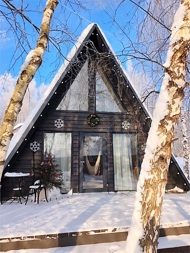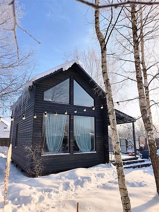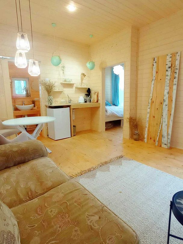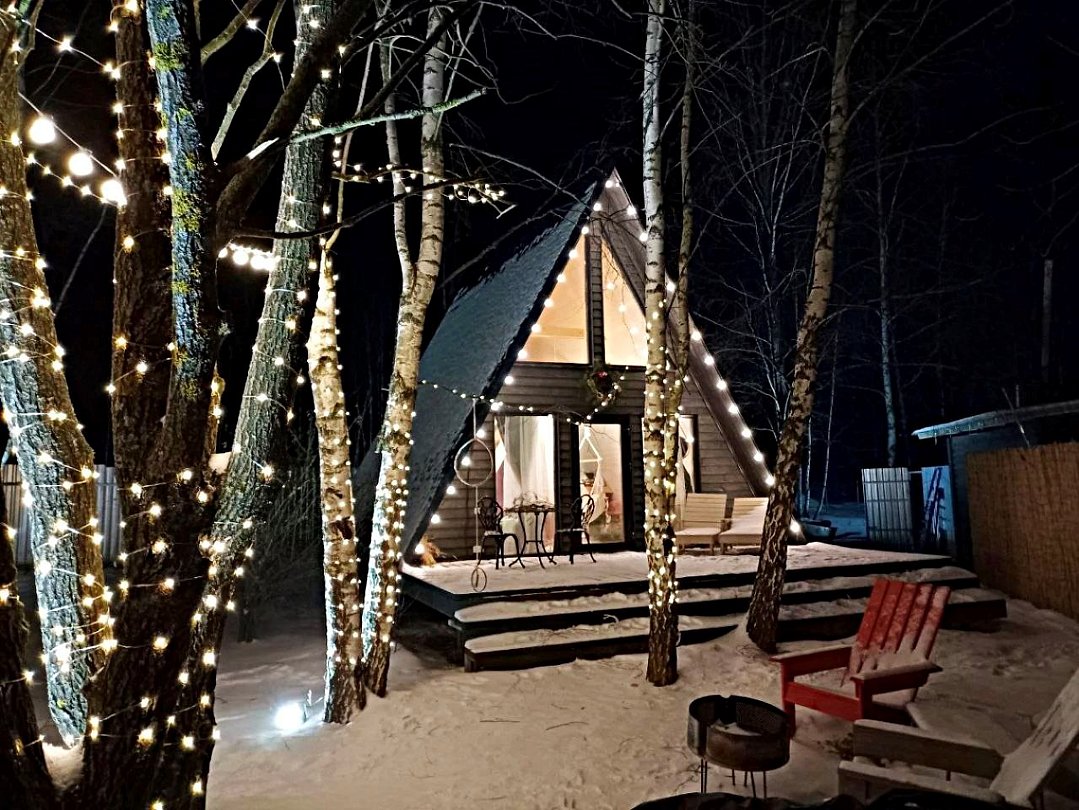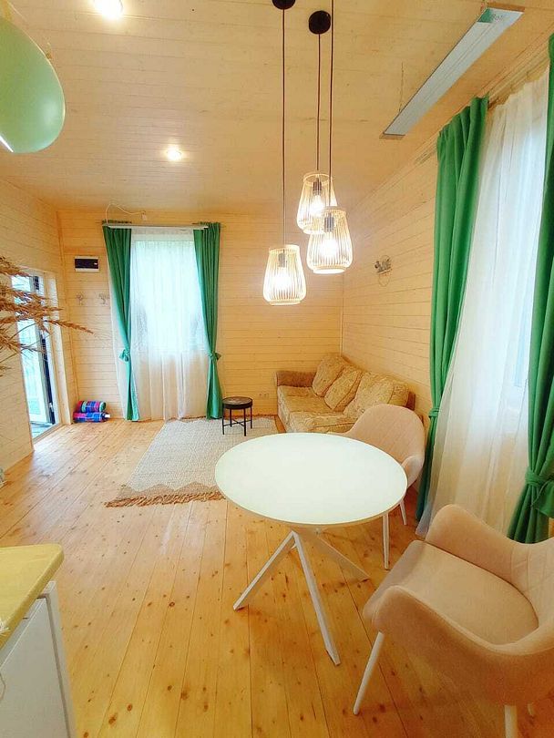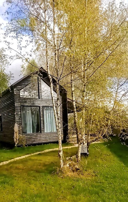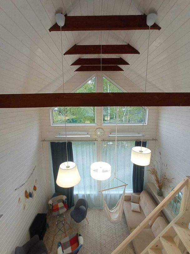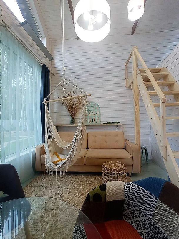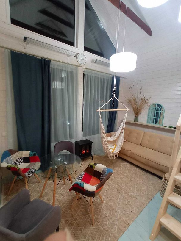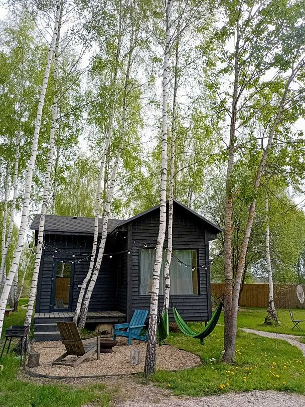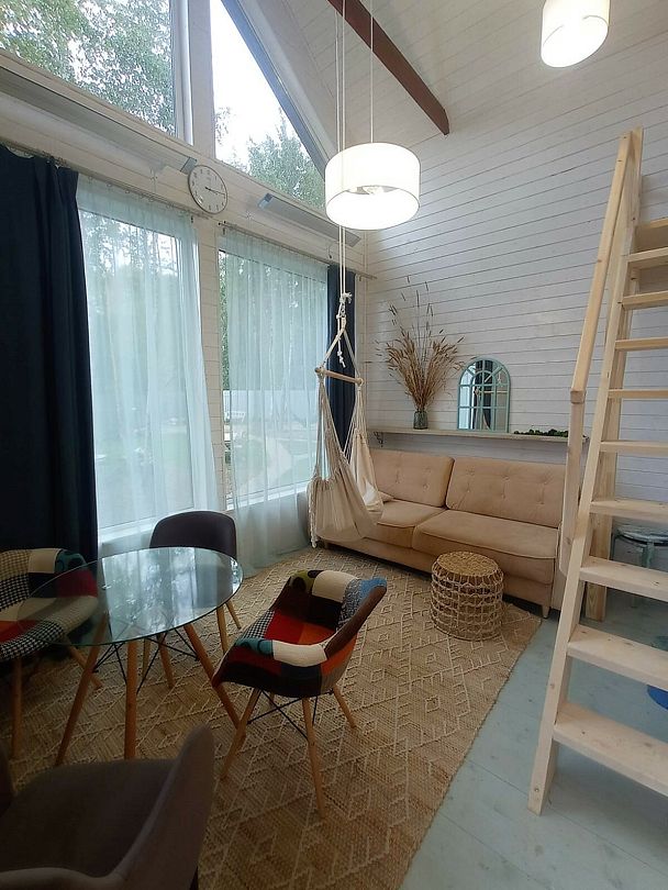 Гламурный домик в смелых цветах. Из окон повсюду видны берёзы и природа. Внутри дома подвесные качели, и электрический камин создают уют. Терраса оборудована уличной мебелью и лежаком Кострище с удобными креслами адирондак, лампочки белтлайт создают душевную атмосферу.Услуги и удобства
