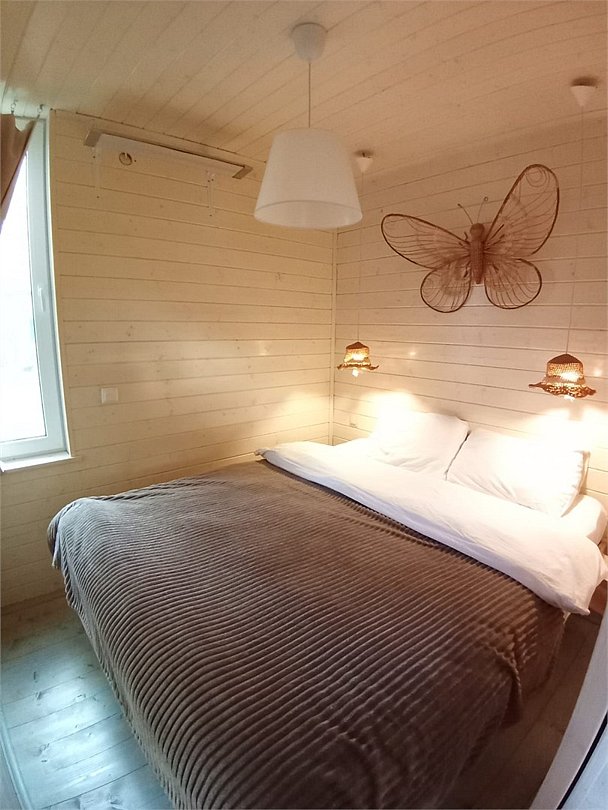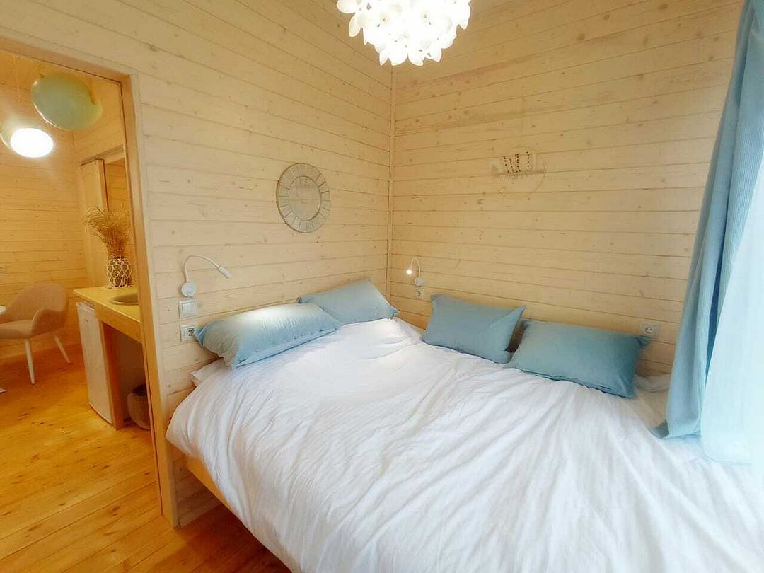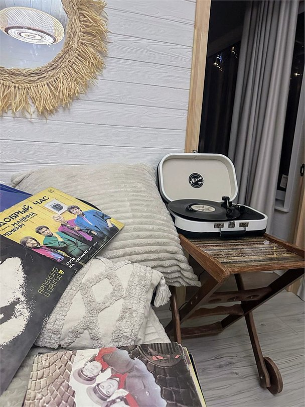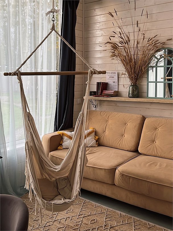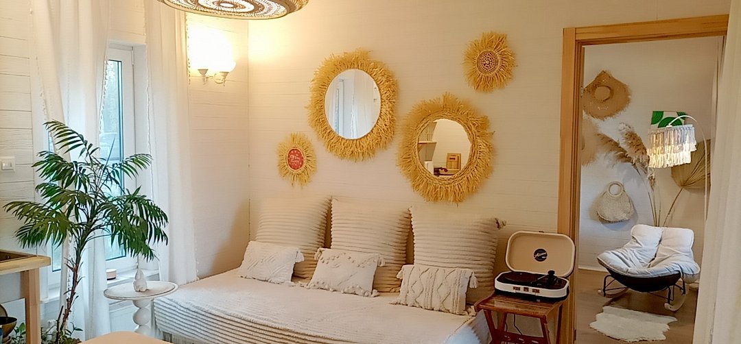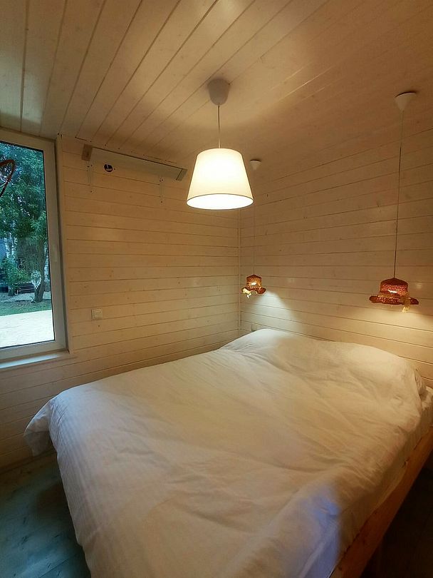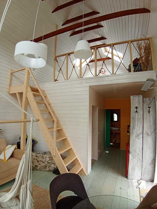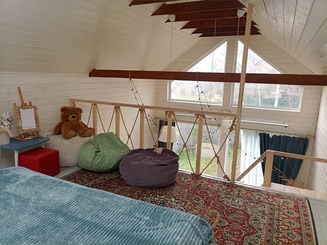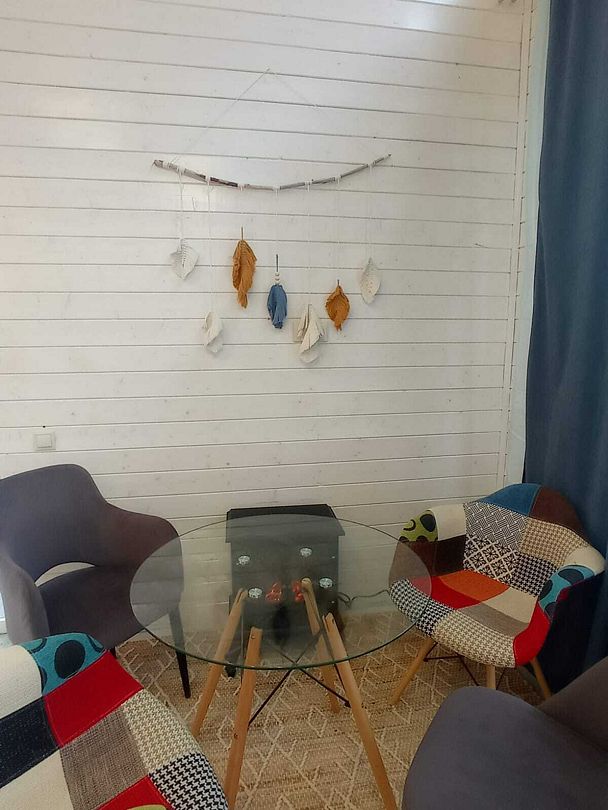 Гламурный домик в смелых цветах. Из окон повсюду видны берёзы и природа. Внутри дома подвесные качели, и электрический камин создают уют. Терраса оборудована уличной мебелью и лежаком Кострище с удобными креслами адирондак, лампочки белтлайт создают душевную атмосферу.Услуги и удобства