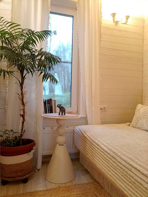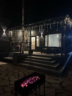 Светлый красивый дом с панорамными окнами и видом на берёзы и двор. "Второй свет" свет и высокие потолки делают пространство воздушным. Большая терраса оборудована уличной мебелью, кострище с удобными деревянными креслами адирондак, лампочки белтлайт создают необыкновенную уютную атмосферу. На втором этаже большая двуспальная кровать 200*200 На первом этаже в комнате -160*200 Раскладной диван Кухня, холодильник, плита, чайник,кофеварка, посуда Санузел с душевой и необходимыми принадлежностями и полотенцами Мангал, Кострище, Пледы. Собственная парковка на 1 авто около дома. Другие авто на парковке под камерами.Услуги и удобства
