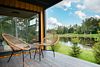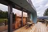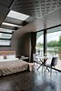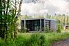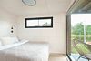 Домик оснащен большими стеклянными окнами и дверями, которые открывают панорамный вид на окружающий лес и озеро.