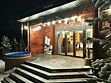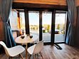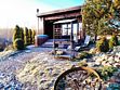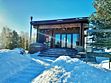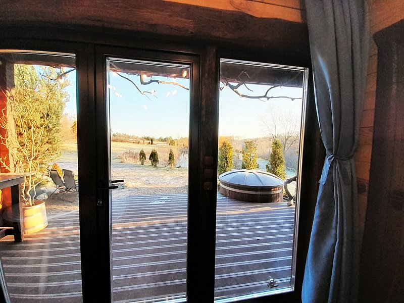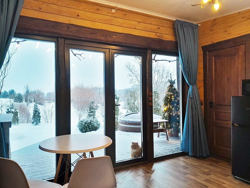 Дом с панорамными окнами с видом на пруд. Банный чан на террасе оплачивается отдельно. Площадь террасы — 15 м.кв. Есть видеопроектор, чтобы смотреть видео прямо из банного чана.