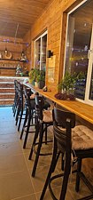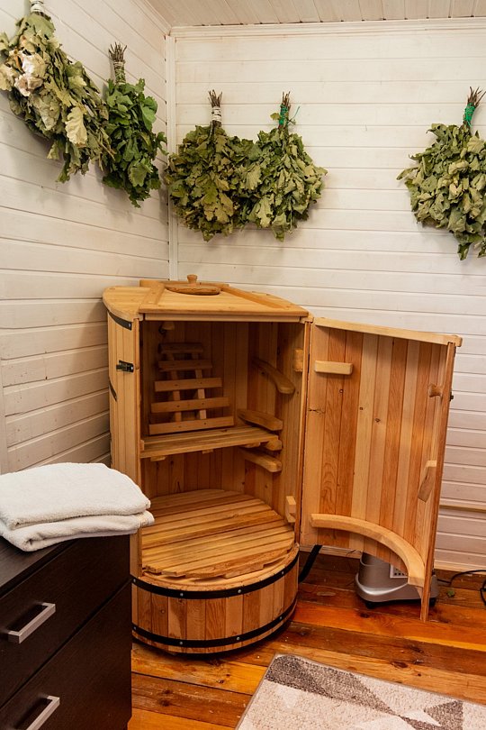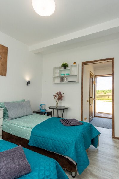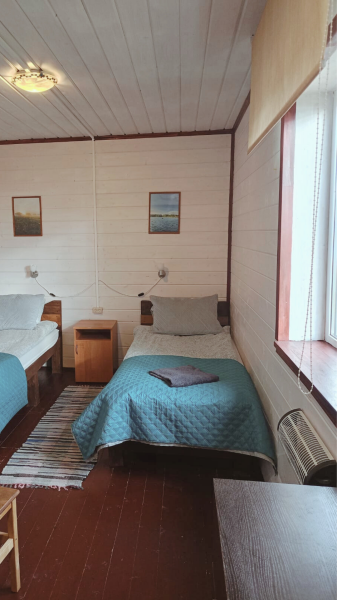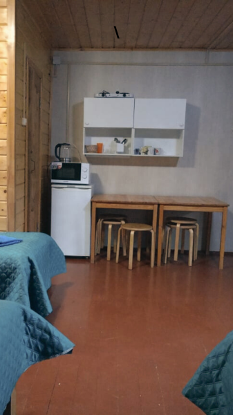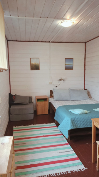 В домике два 2-х местных номера. Номера оборудованы 2 односпальными или 1 двуспальной кроватями, холодильник, набор посуды для приготовления пищи. В каждом номере отдельный санузел с горячей водой в душе. Все номера с отоплением.