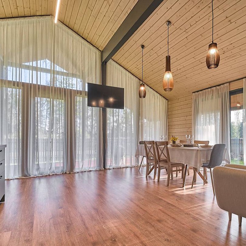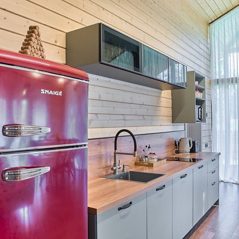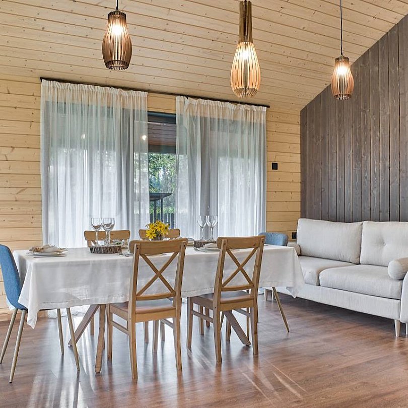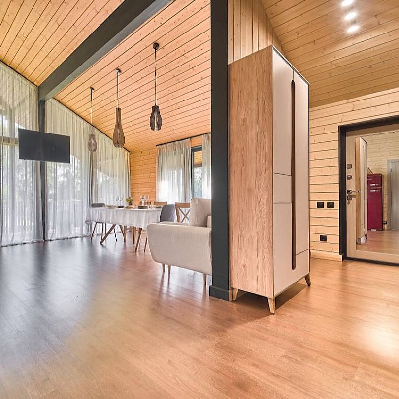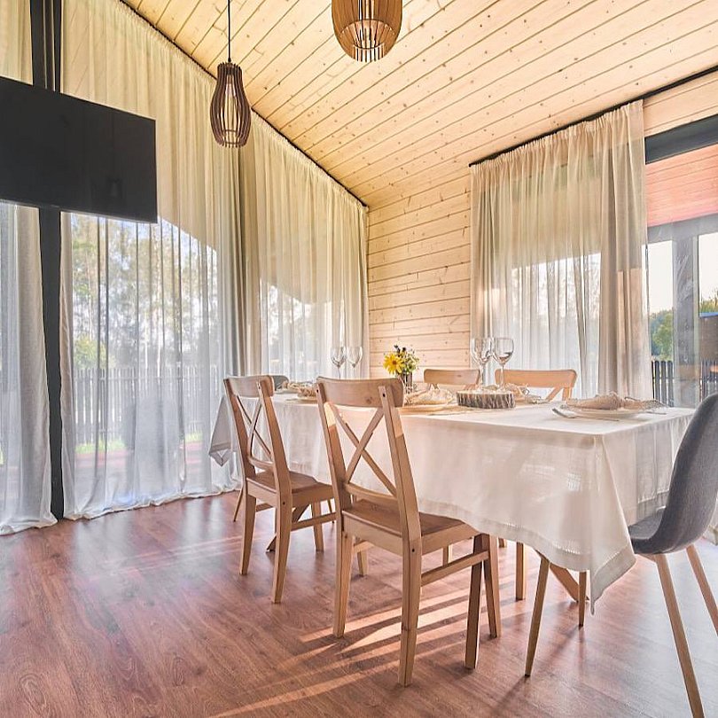 В гостиной есть два телевизора, которые можно смотреть всей семьёй. Кухня-гостиная с панорамным обеденным столом на шесть человек объединяет всех гостей. Здесь есть индукционная плита, современная техника и посуда на двенадцать человек. Это создаёт атмосферу домашнего уюта.