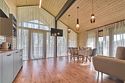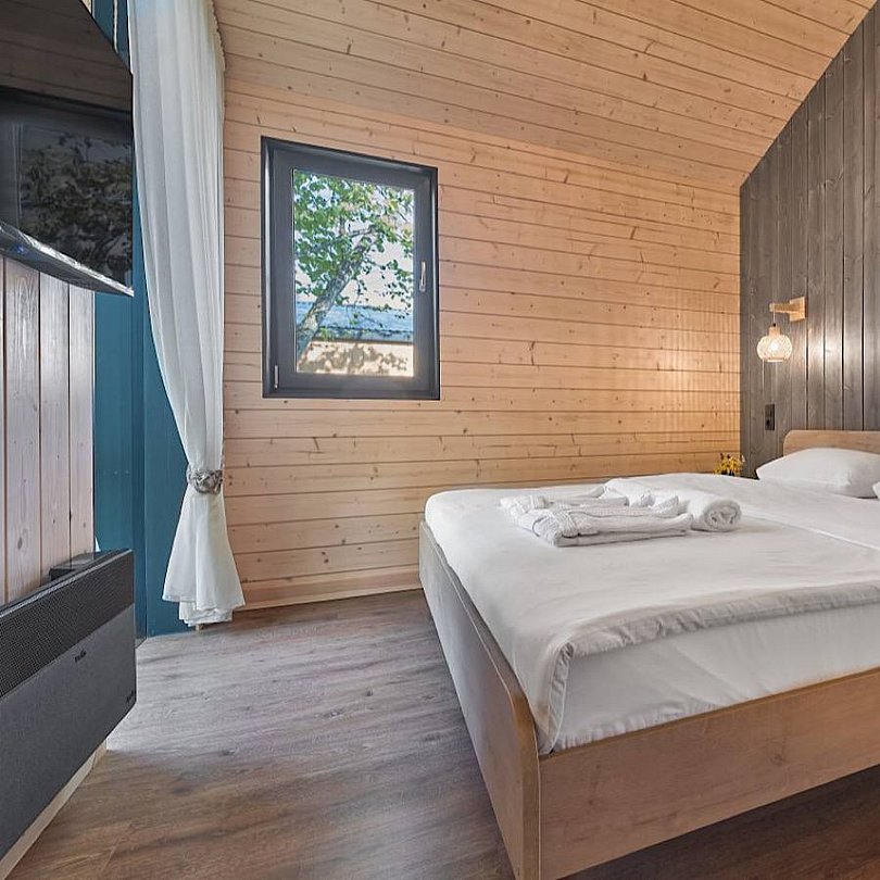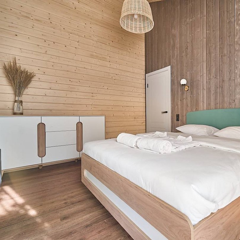 Дом находится всего в ста метрах от живописного озера. Он создан для тех, кто хочет насладиться природой, не отказываясь от городского комфорта. В доме три просторные спальни. В двух из них стоят двуспальные кровати, а в третьей — двухъярусная кровать для детей. В гостиной есть раскладной диван, который можно использовать как дополнительное спальное место.