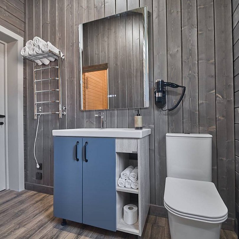В ванной комнате есть душевая кабина, зеркало и полотенцесушитель. Рядом с ванной расположена компактная сауна.