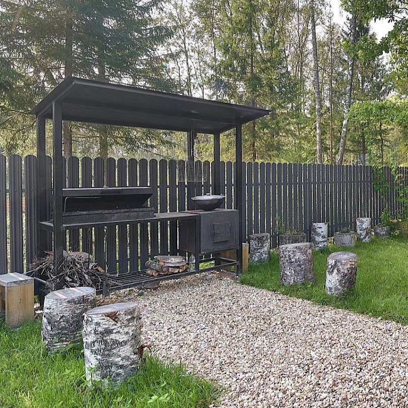 - Просторная мангальная зона с террасой, мангалом, шампурами, решеткой и казаном на 12 литров.