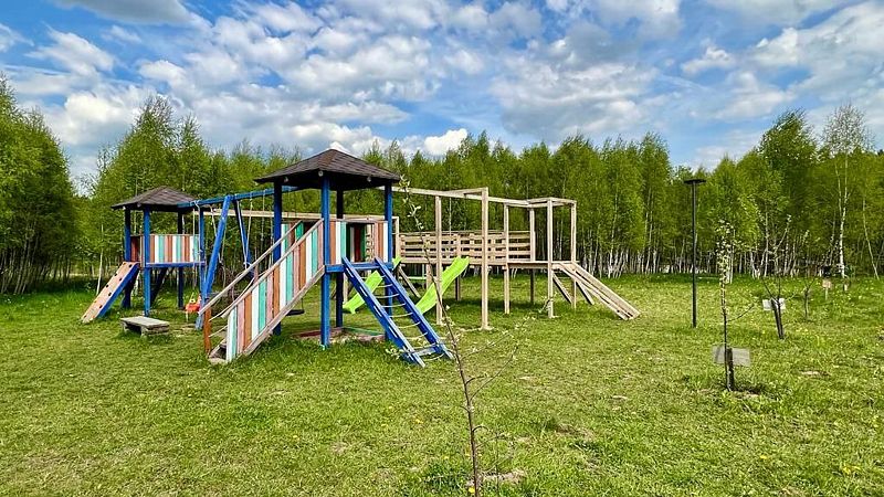 Качели, горки, полоса препятствий и два спортивных батута: для самых маленьких и для ребятишек постарше; спортивный комплекс.