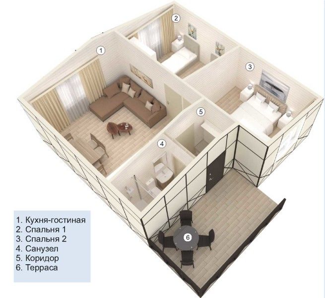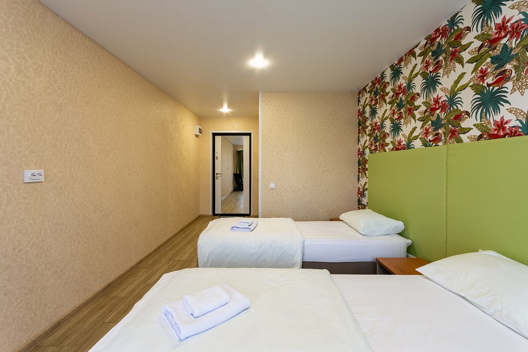 - 1 двуспальная кровать, 2 односпальные кровати и диван-кровать.