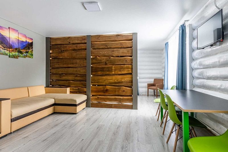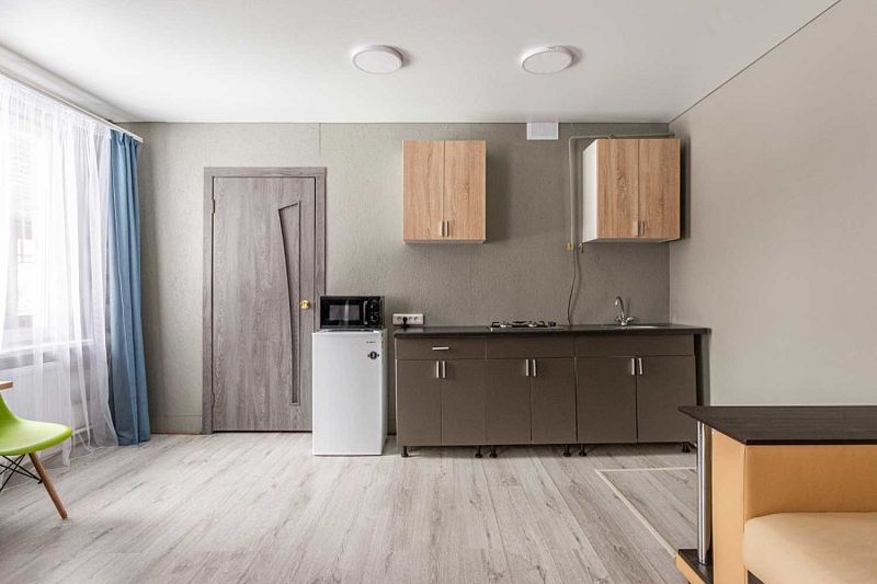 Номер состоит из двух комнат: общая зона для отдыха, кухня и отдельная комната. Мини-кухня в номере укомплектована всем необходимым: газовой плитой, холодильником, чайником, посудой и кухонными принадлежностями. В номере имеются две двуспальные кровати и диван для комфортного сна.