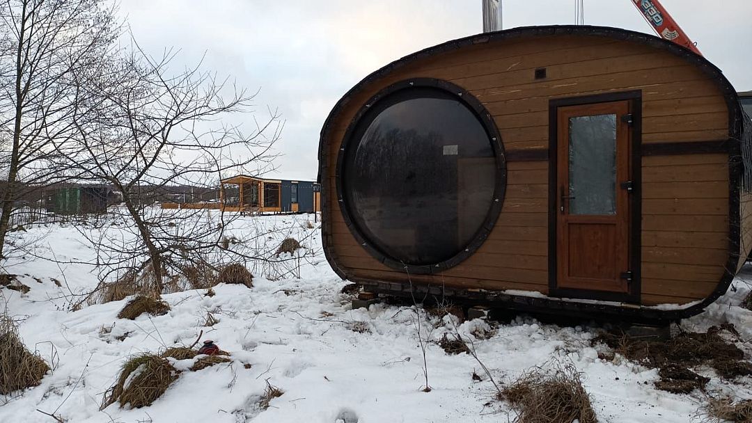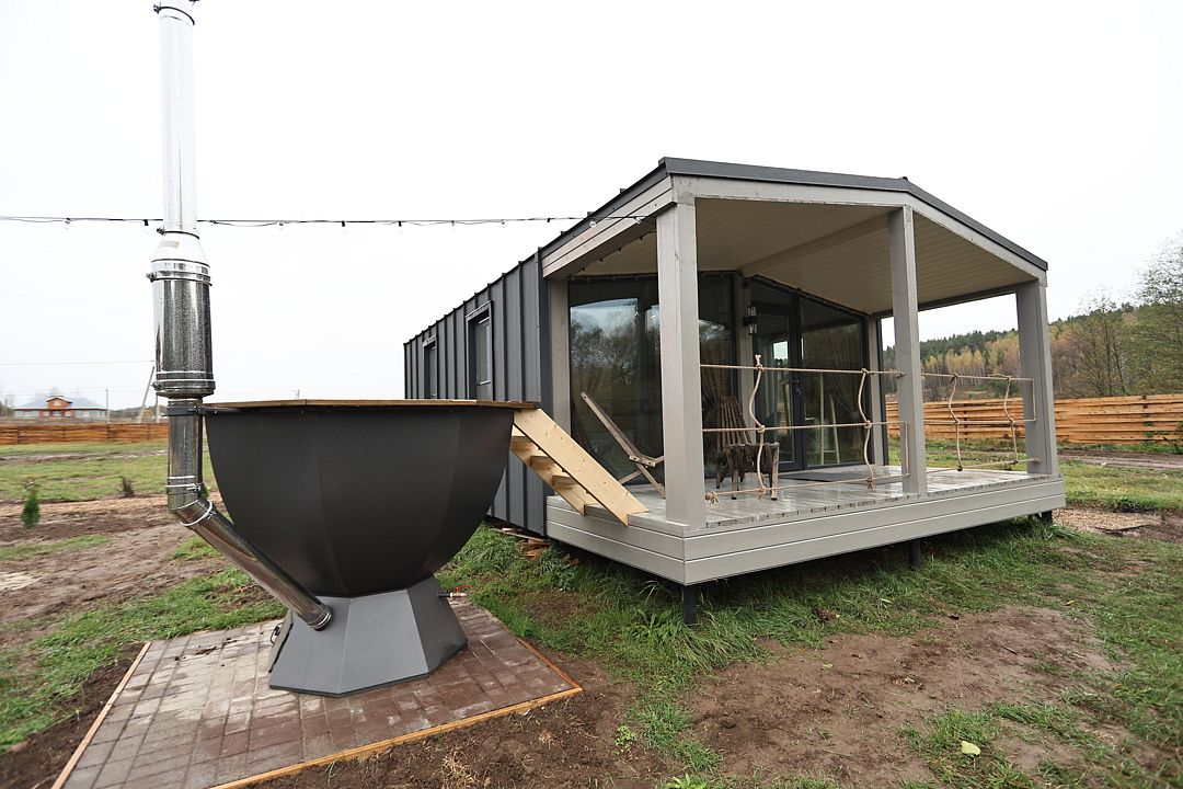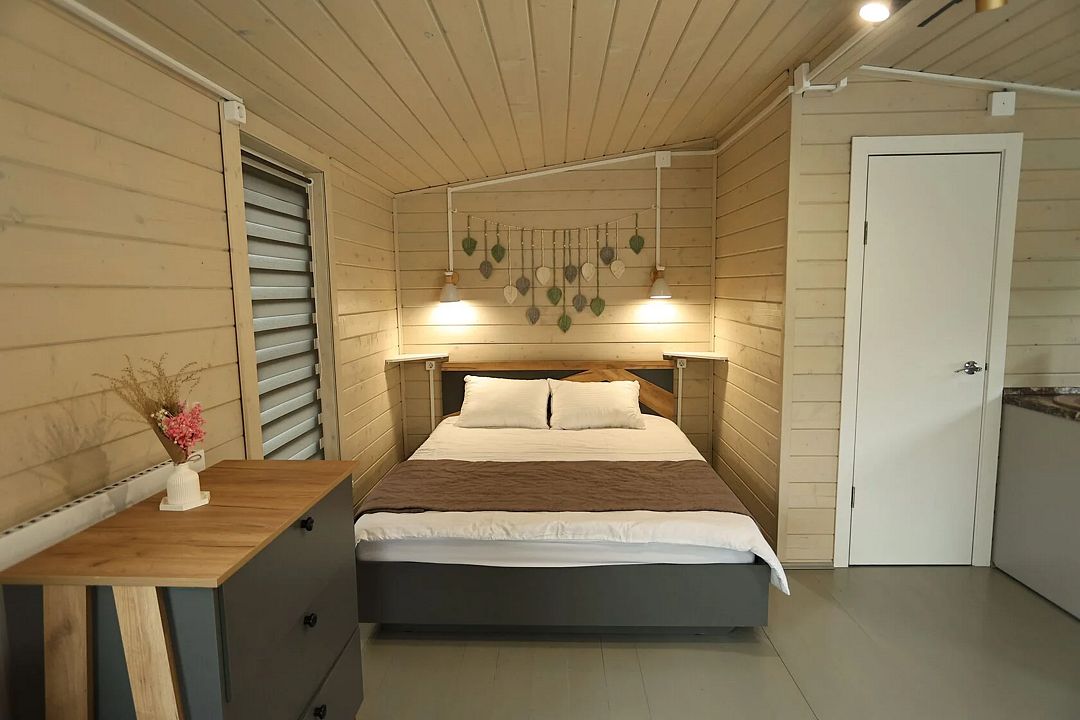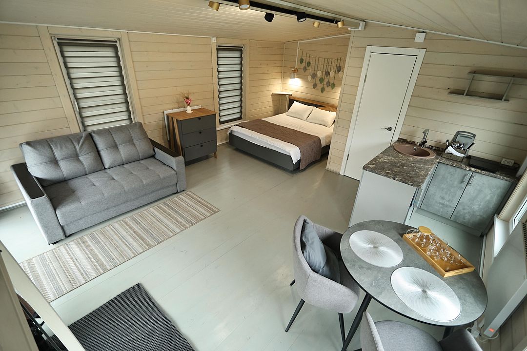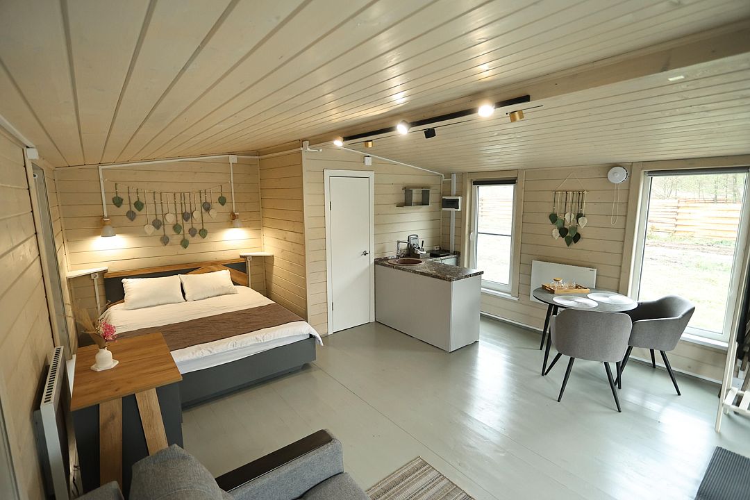 Домик студия в стиле барн, с панорамным остеклением входной зоны, в доме есть полноценная двухспальная кровать, кухня, раскладной диван для отдыха с возможностью использования как два доп. места.