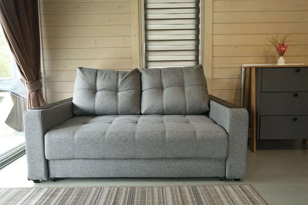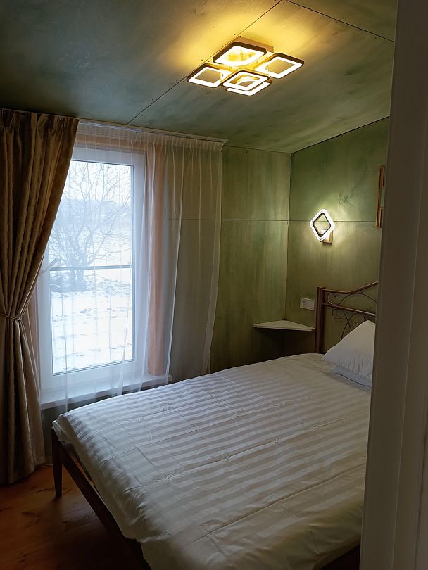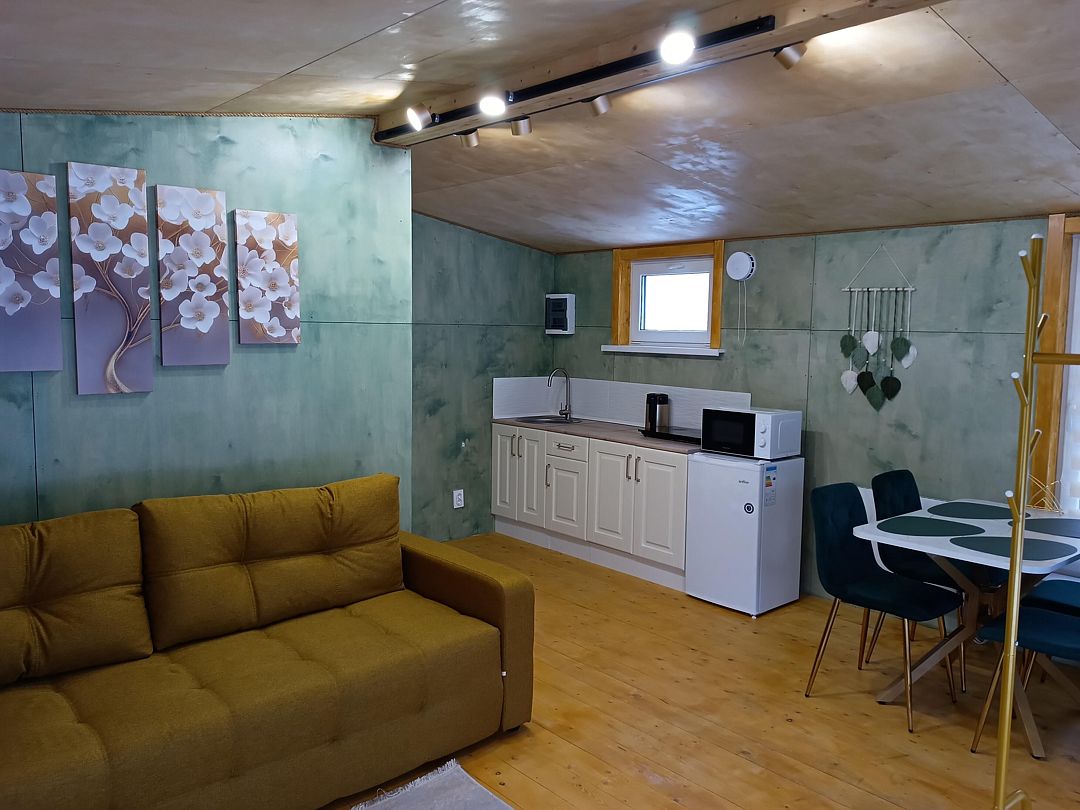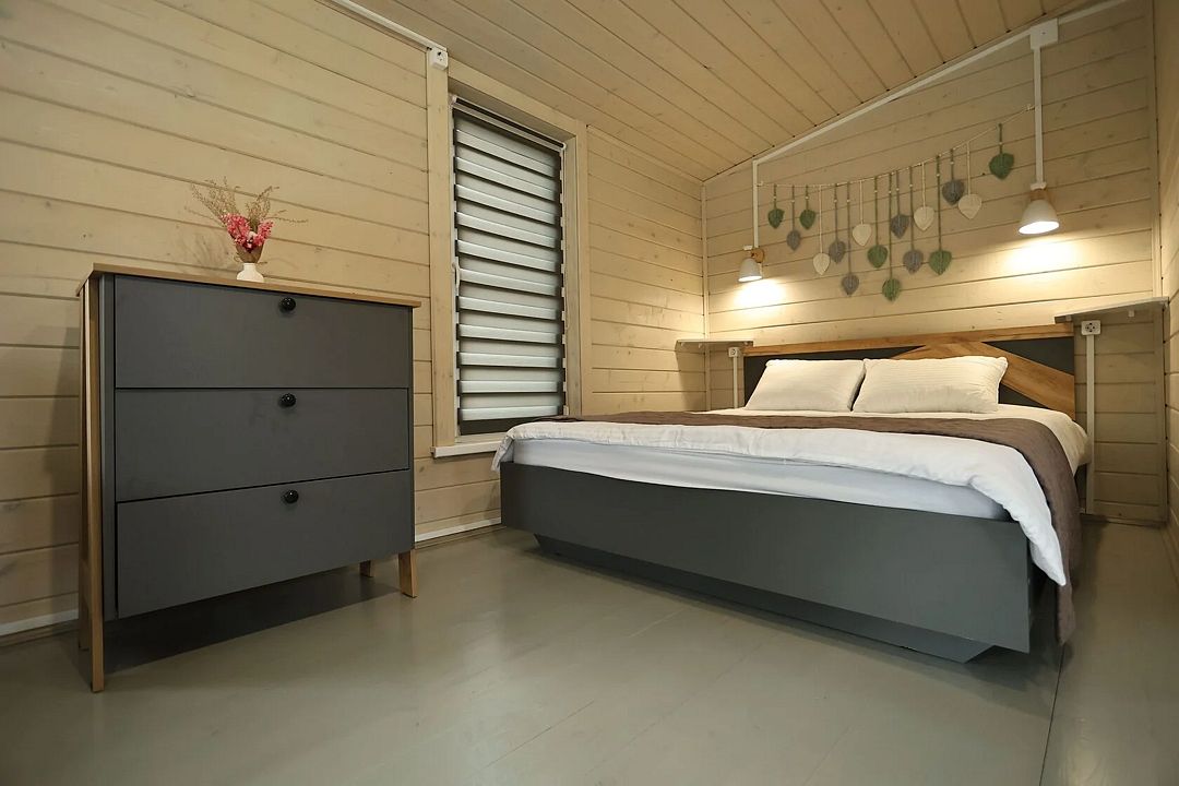 В доме есть полноценная двухспальная кровать, кухня, раскладной угловой диван для отдыха с возможностью использования как два доп места. Возле домика есть мангальная зона.