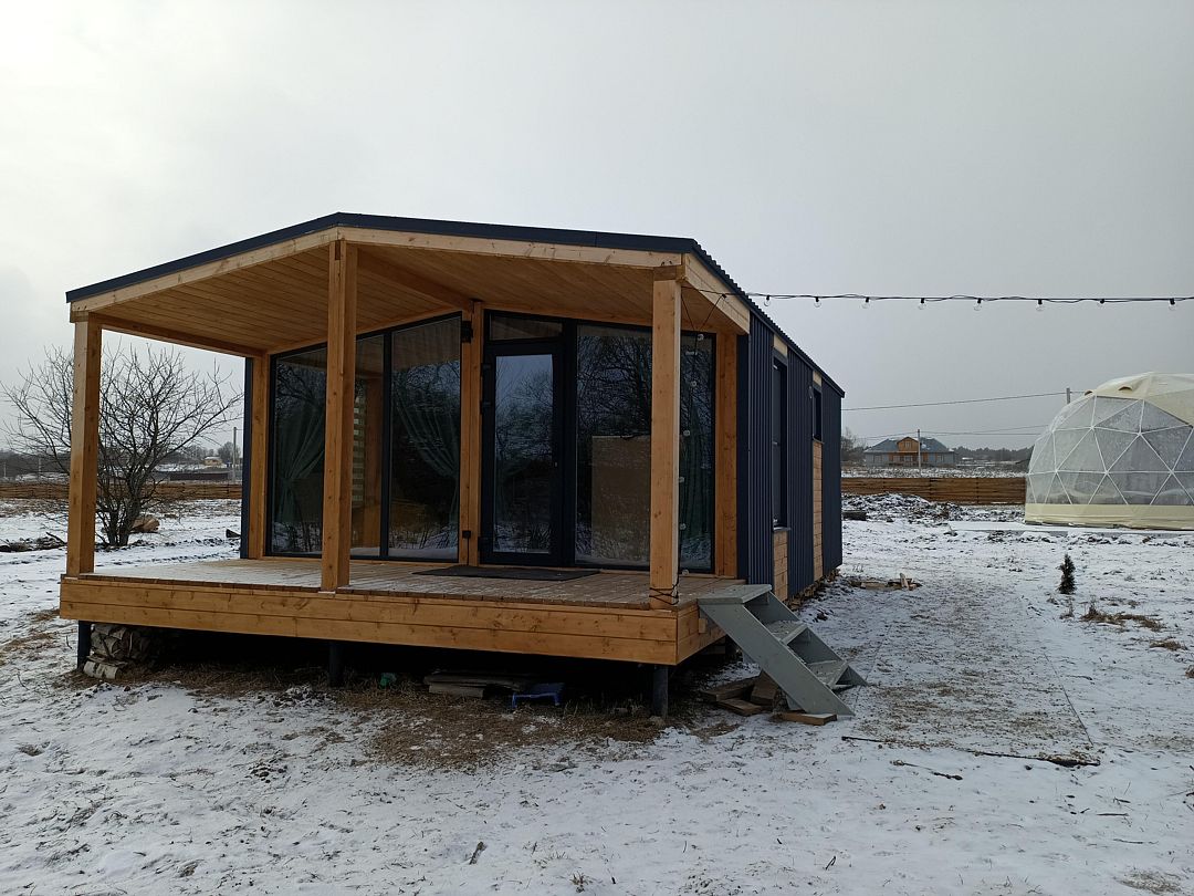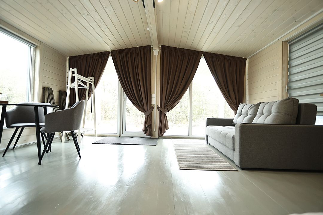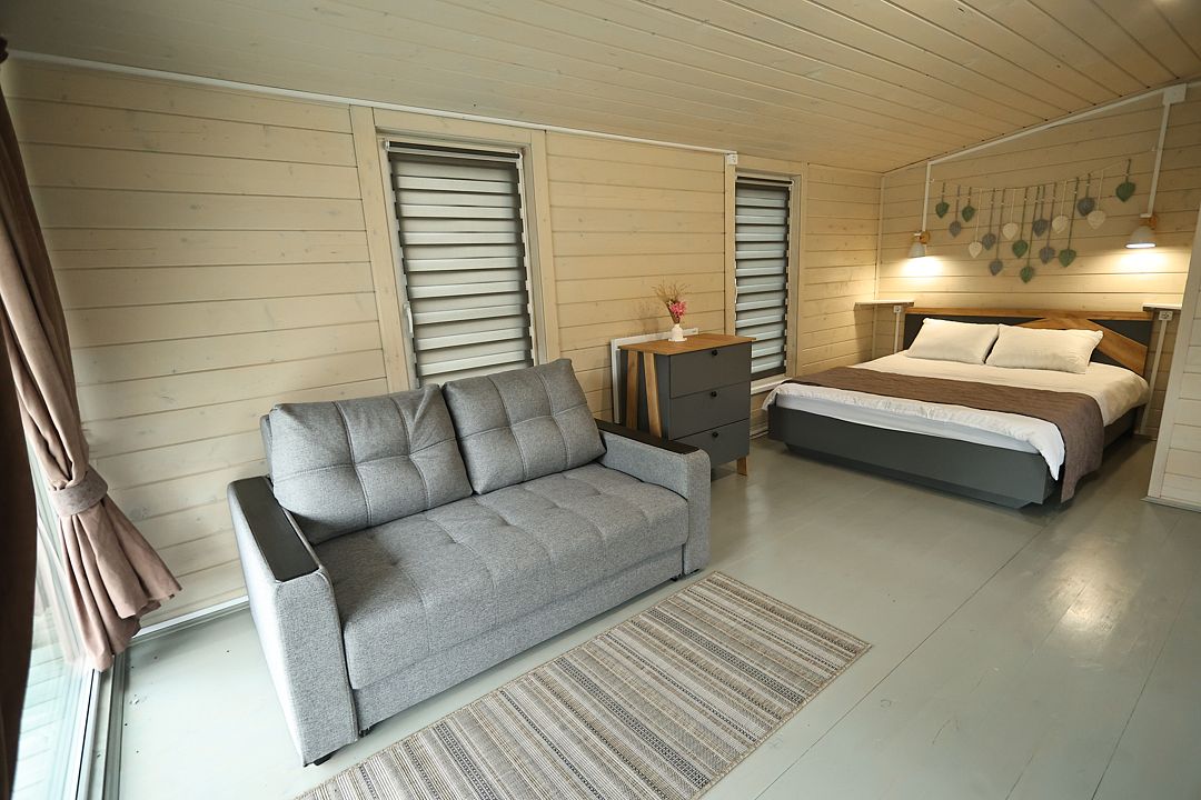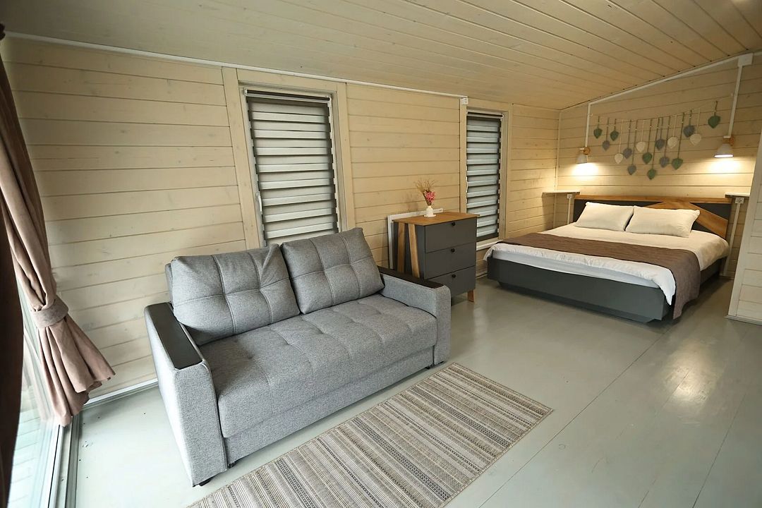 Домик студия в стиле барн, с панорамным остеклением входной зоны, в доме есть полноценная двухспальная кровать в отдельной комнате, кухня, раскладной диван для отдыха с возможностью использования как два доп. места.