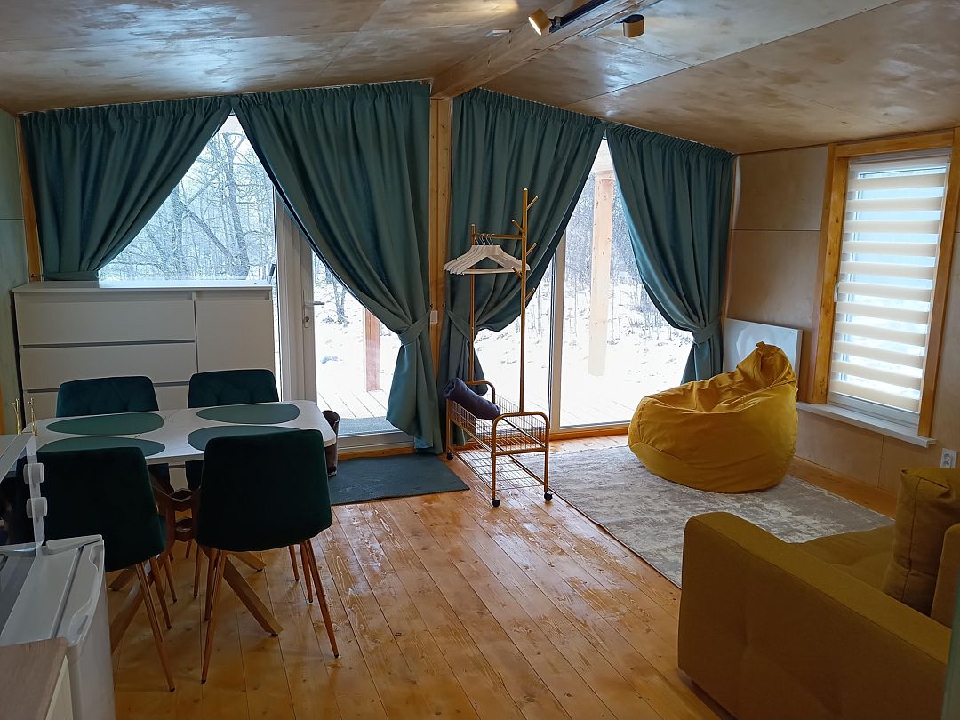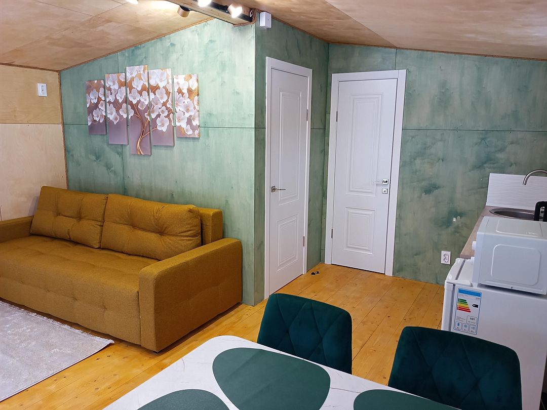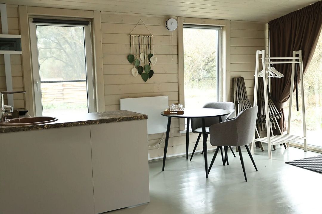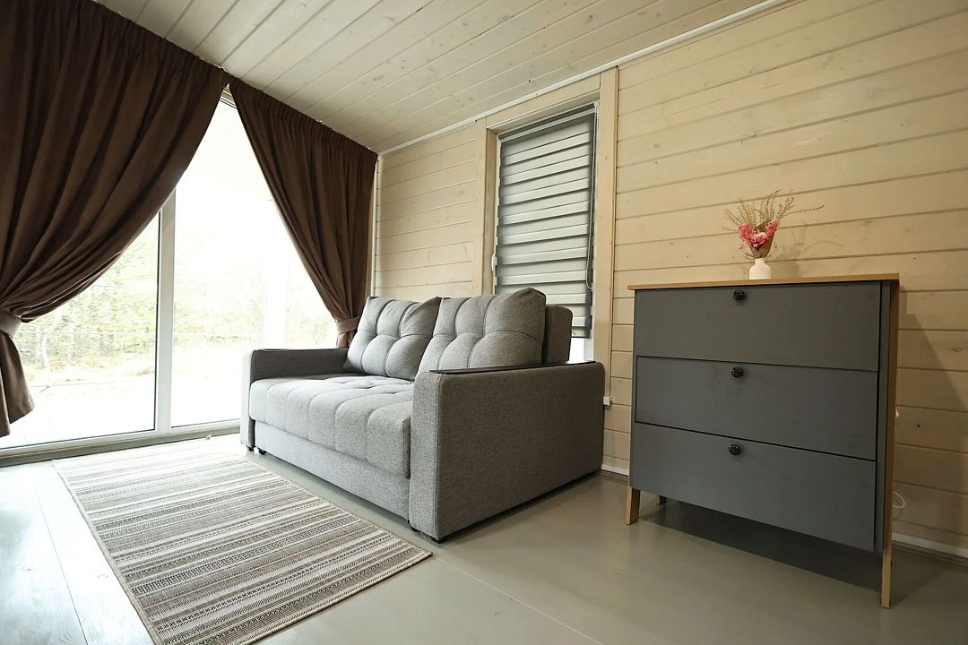 Домик студия в стиле барн, с панорамным остеклением входной зоны, в доме есть полноценная двухспальная кровать в отдельной комнате, кухня, раскладной диван для отдыха с возможностью использования как два доп. места.