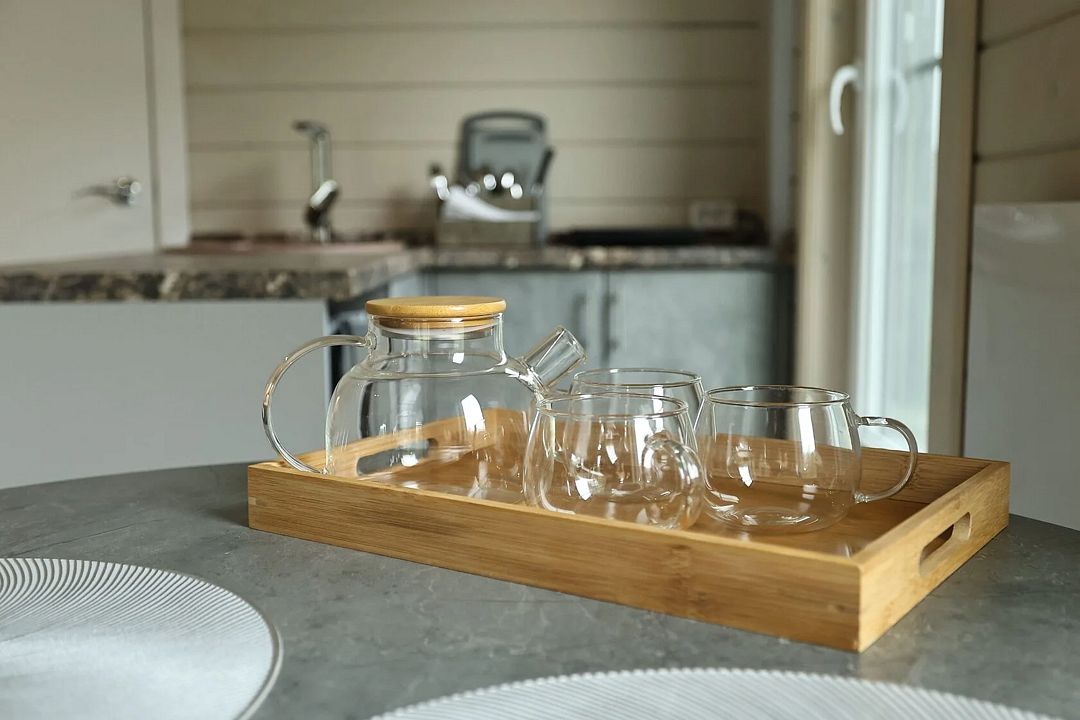 - полностью укомплектованная кухня (холодильник, комплект посуды на четыре человека, винные бокалы, чайник, заварник, посуда для приготовления еды, однокомфорочная индукционная плита, чай, сахар).