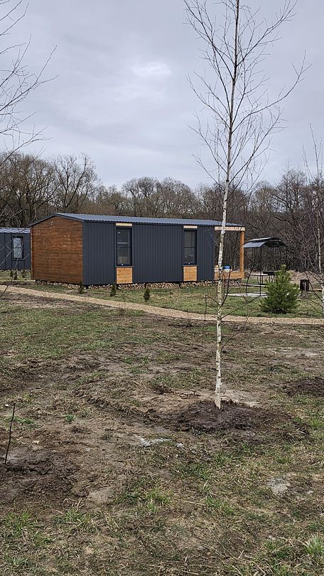 Возле домика есть мангальная зона. Отделка дома выполнена из шлифованной фанеры в золотисто-зеленых тонах.