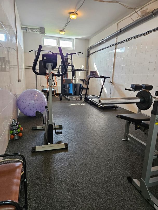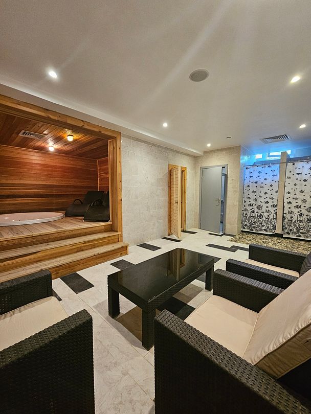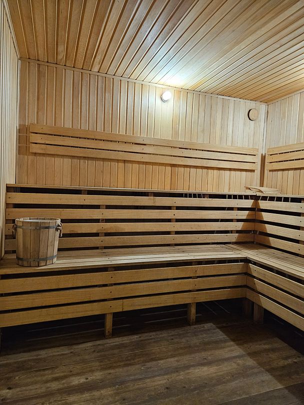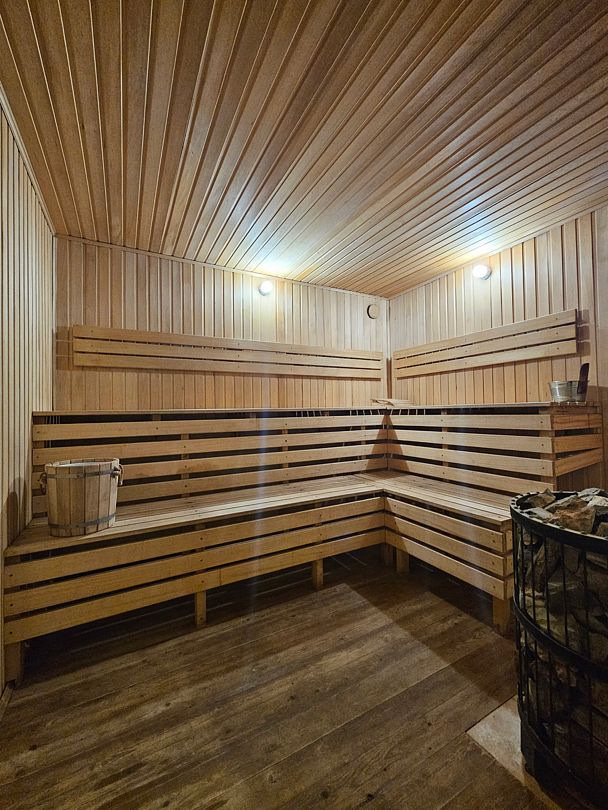Гости могут расслабиться в банном комплексе с финской сауной, а для активного отдыха предусмотрен небольшой тренажерный зал.