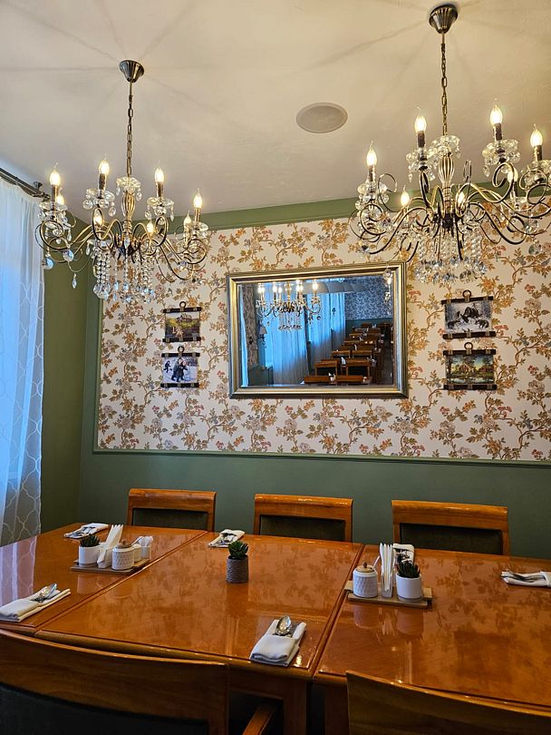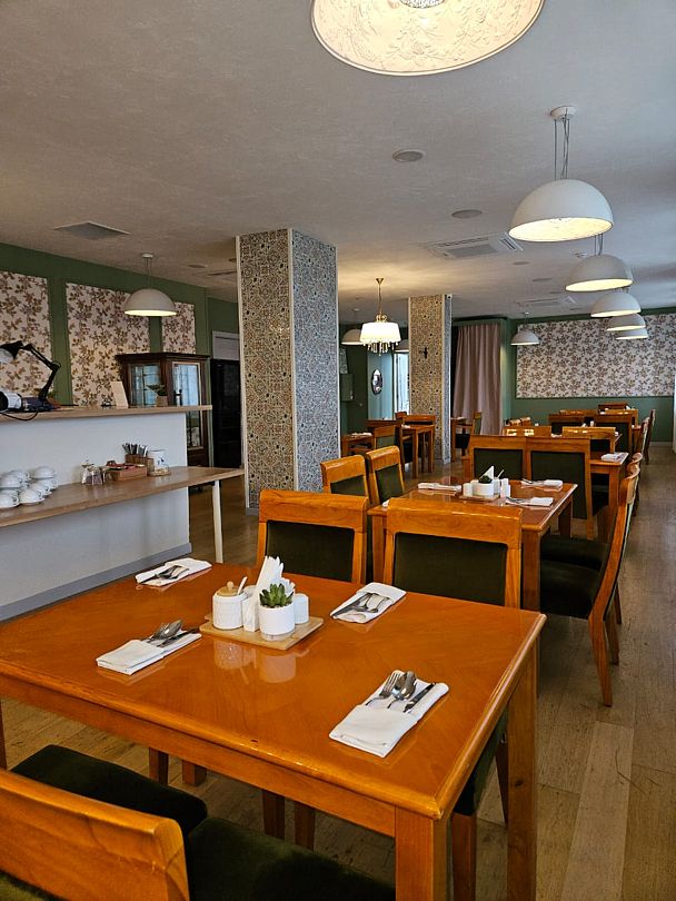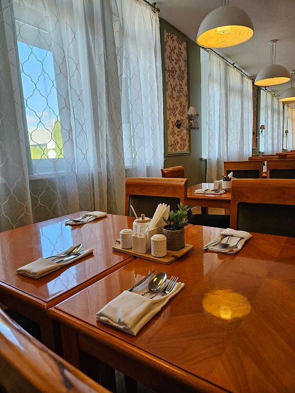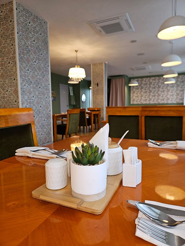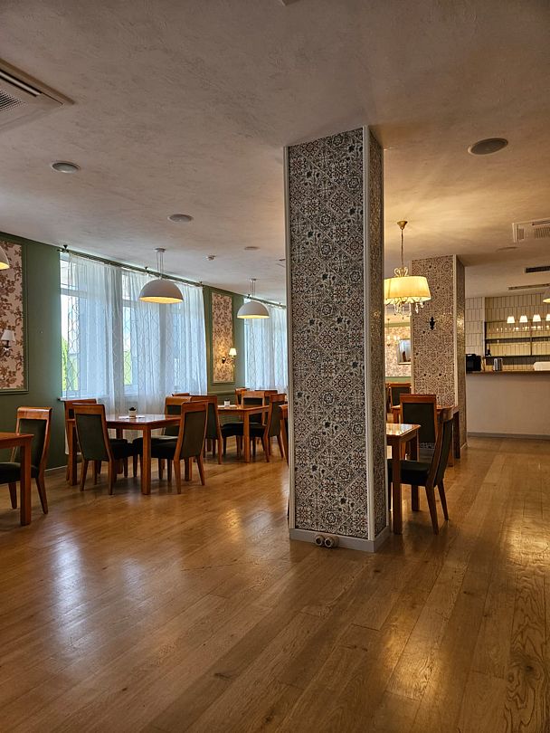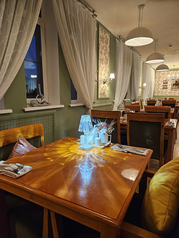 На первом этаже гостинично-ресторанного комплекса находится уютный ресторан, предлагающий блюда домашней кухни, а также бар и банкетный зал под названием «Каприз», работающий по предварительной записи.