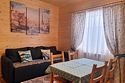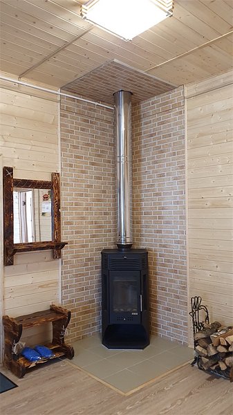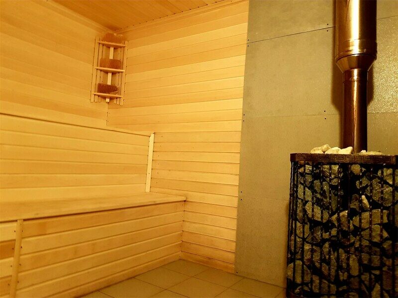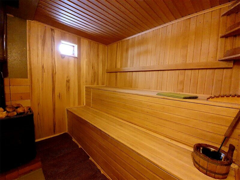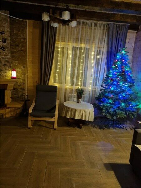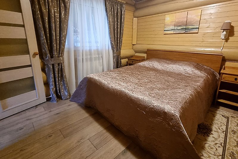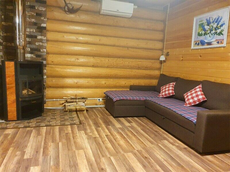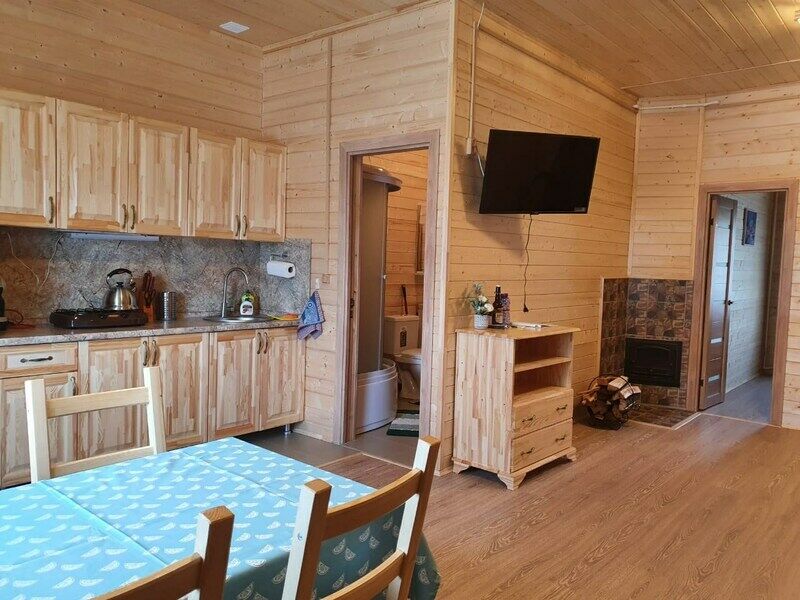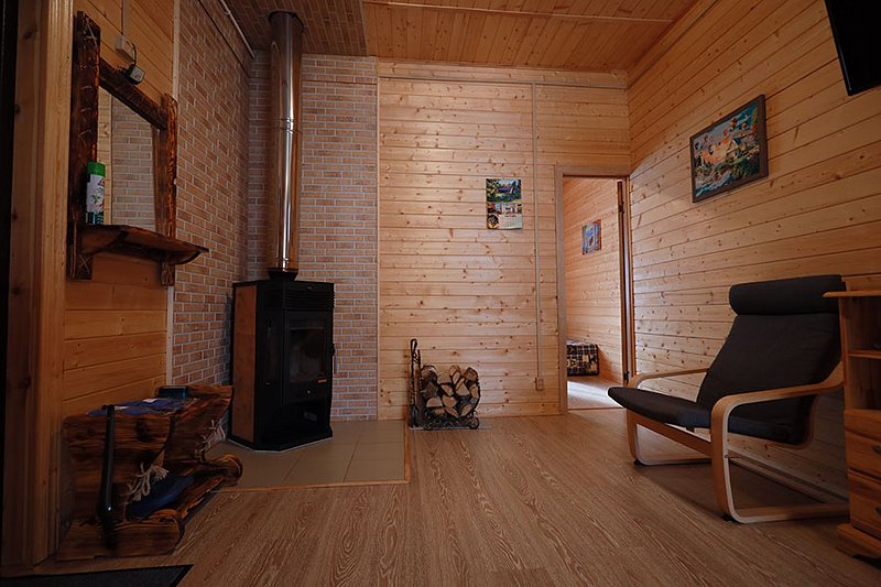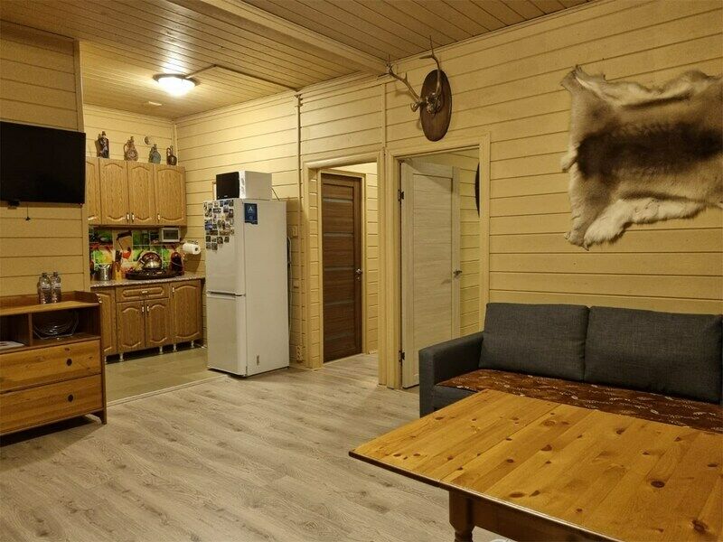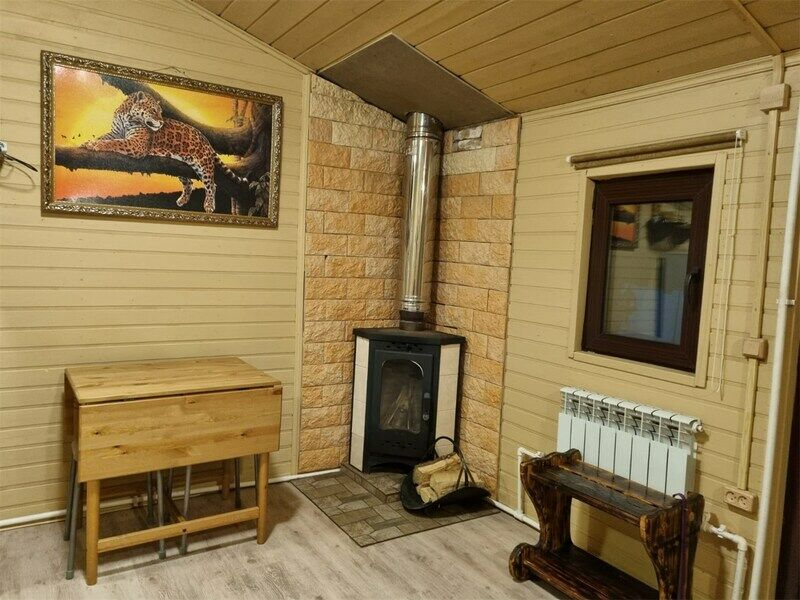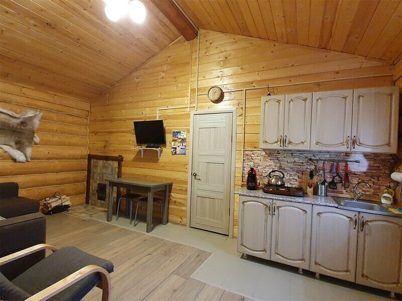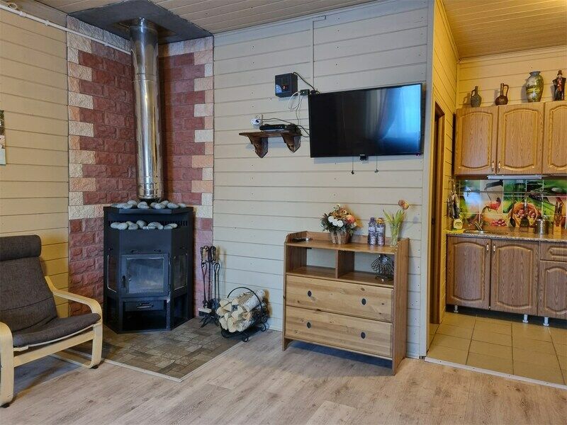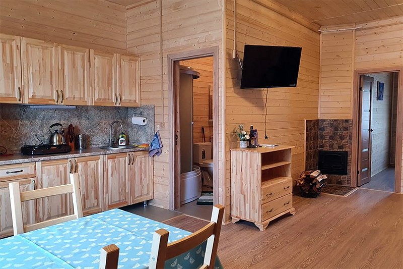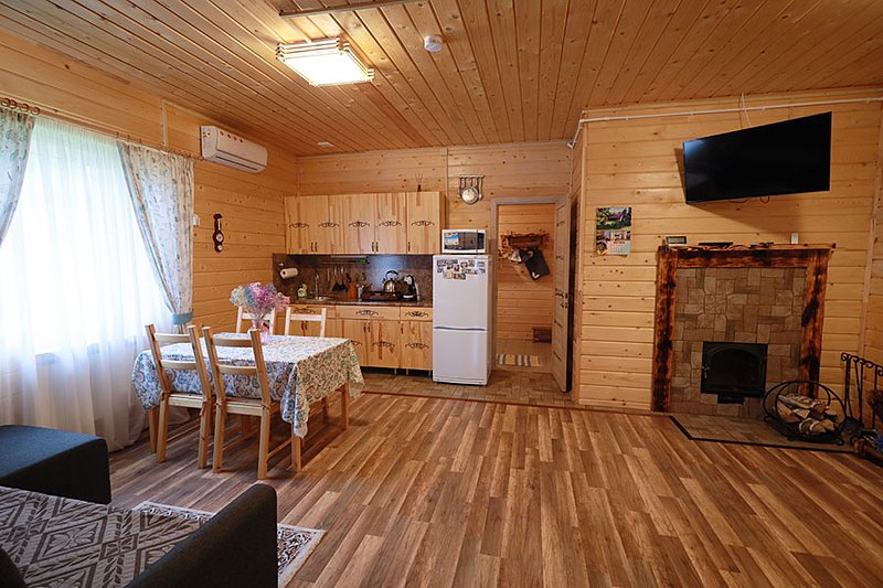 В коттедже портал топки/сауны напоминает камин. Круглогодичное проживание. Кухня оснащена кухонным гарнитуром, мойкой, набором посуды, варочной газовой панелью, холодильником , стиральная машина в тех узле и прочими необходимыми мелочами. Плазменным ТВ с цифровым телевидением. Кондиционер. Отопление. У дома есть своя парковка.