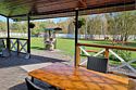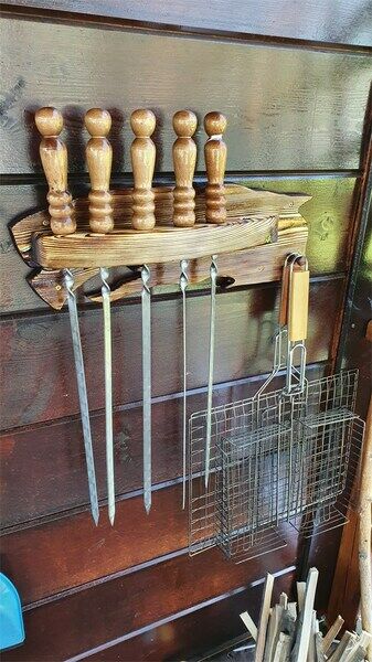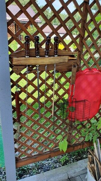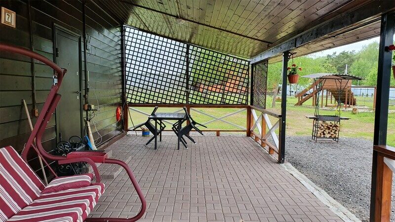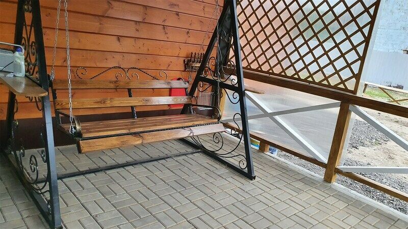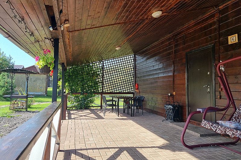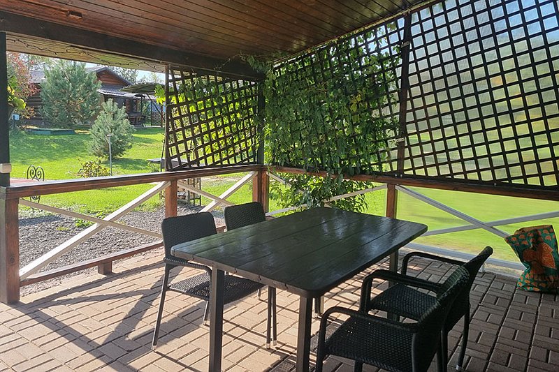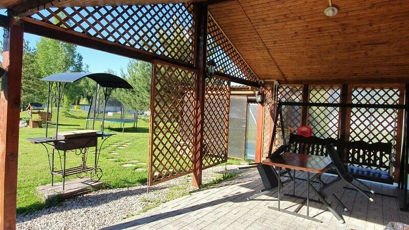 У коттеджа своя крытая терраса и мангальная зона и принадлежности для приготовления шашлыков. Шампура и решетка.