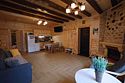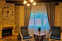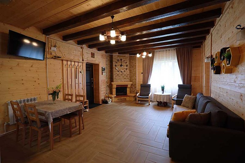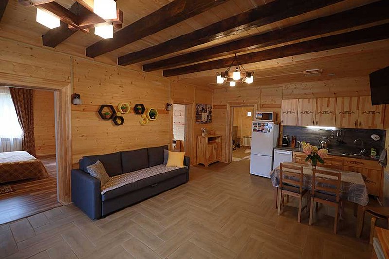 4 комнаты. 2 спальни, 2 зала, камин на дровах, сауна на дровах. 2 кухни, 2-ве ванных комнаты, посудомойка, отопление, тв, интернет и т.д.