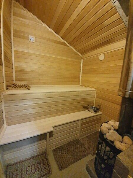 В коттедже имеется сауна на дровах и камин. Имеется задний выход из сауны в собственную закрытую купель и далее на задний дворик. Кухня оснащена кухонным гарнитуром, мойкой, набором посуды, варочной газовой панелью, холодильником и прочими необходимыми мелочами, посудомойка.