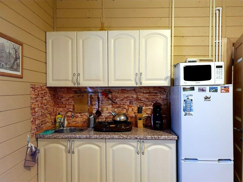 Кухня оснащена кухонным гарнитуром, мойкой, набором посуды, варочной газовой панелью, холодильником и прочими необходимыми мелочами. Плазменным ТВ с цифровым телевидением