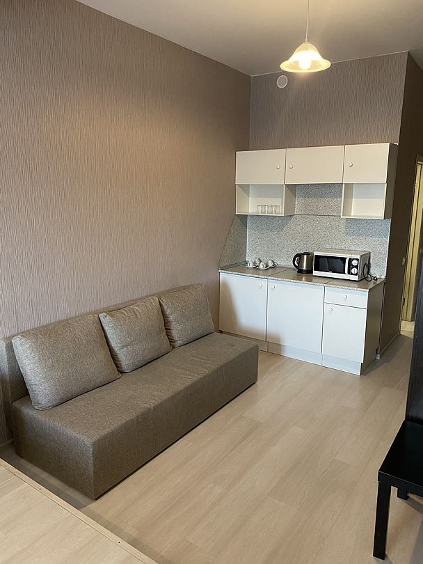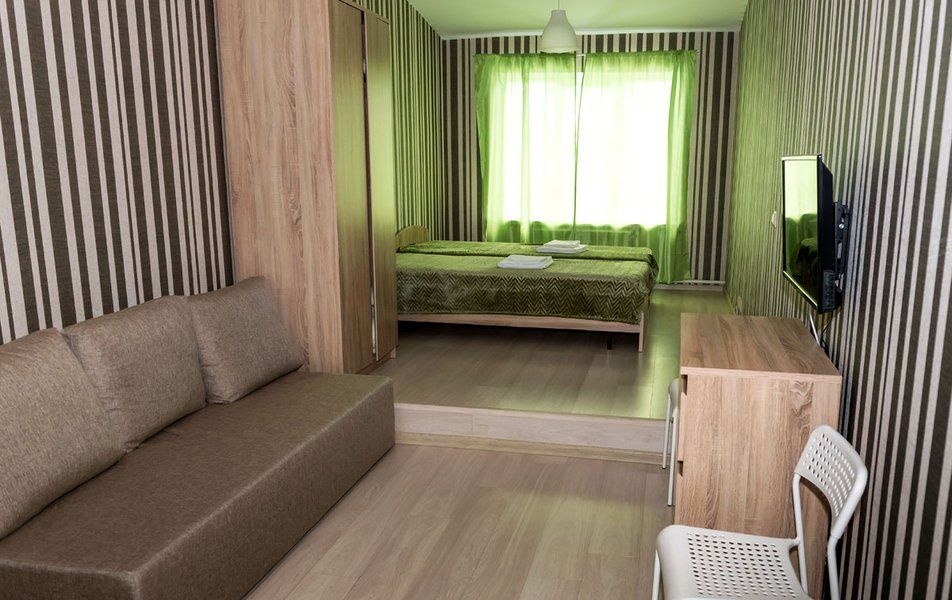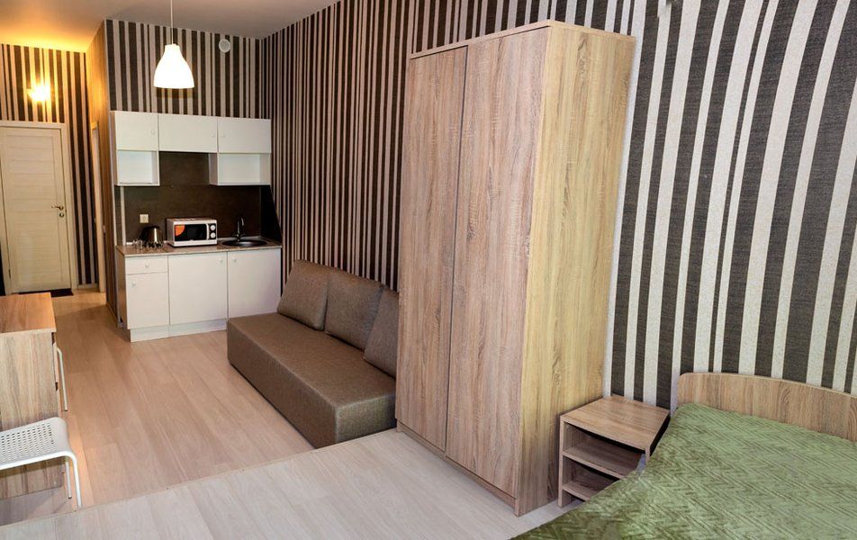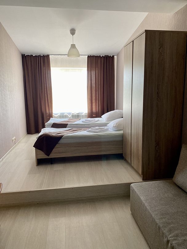 Номер категории Студия максимально вмещает в себя 4 гостя. Комфортный просторный номер включает в себя 2 основных места и 2 дополнительных. В номере: шкаф, тумбы, 2 односпальные кровати, двуспальный диван, телевизор, чайник, чайный набор, холодильник, микроволновая печь, санузел с ванной комнатой