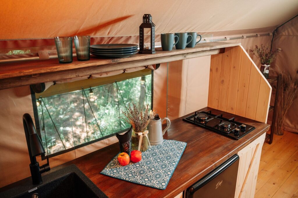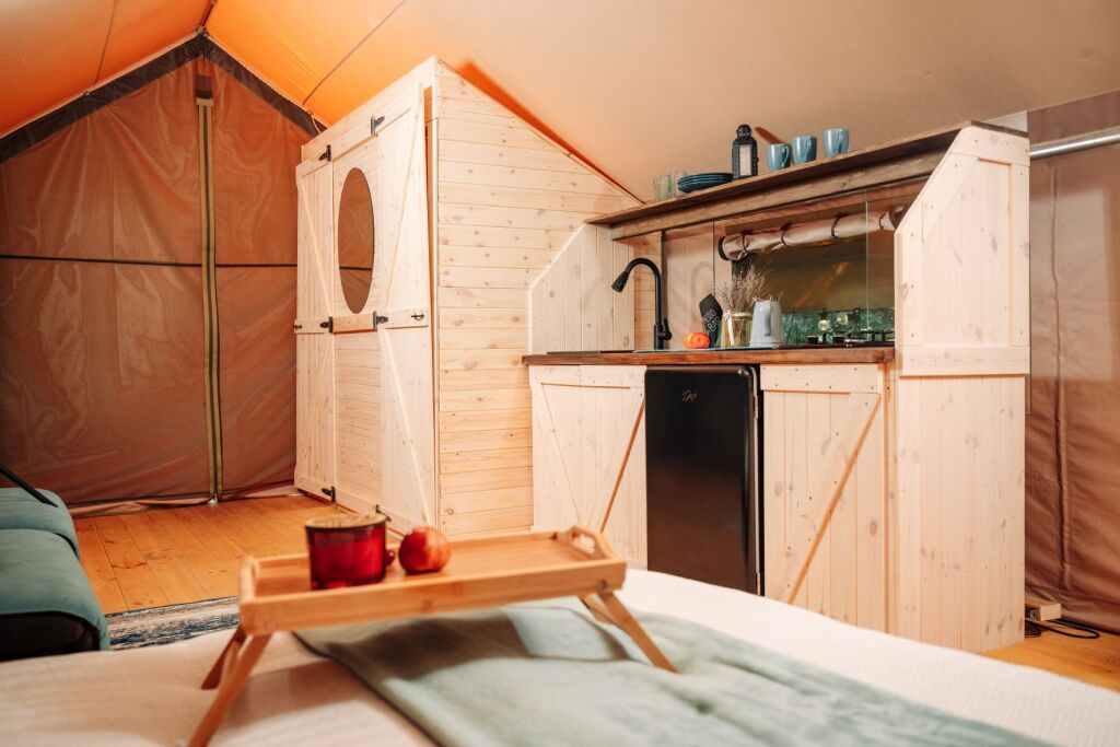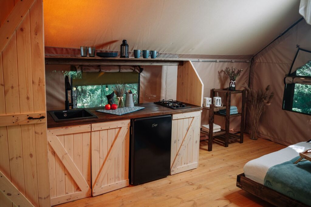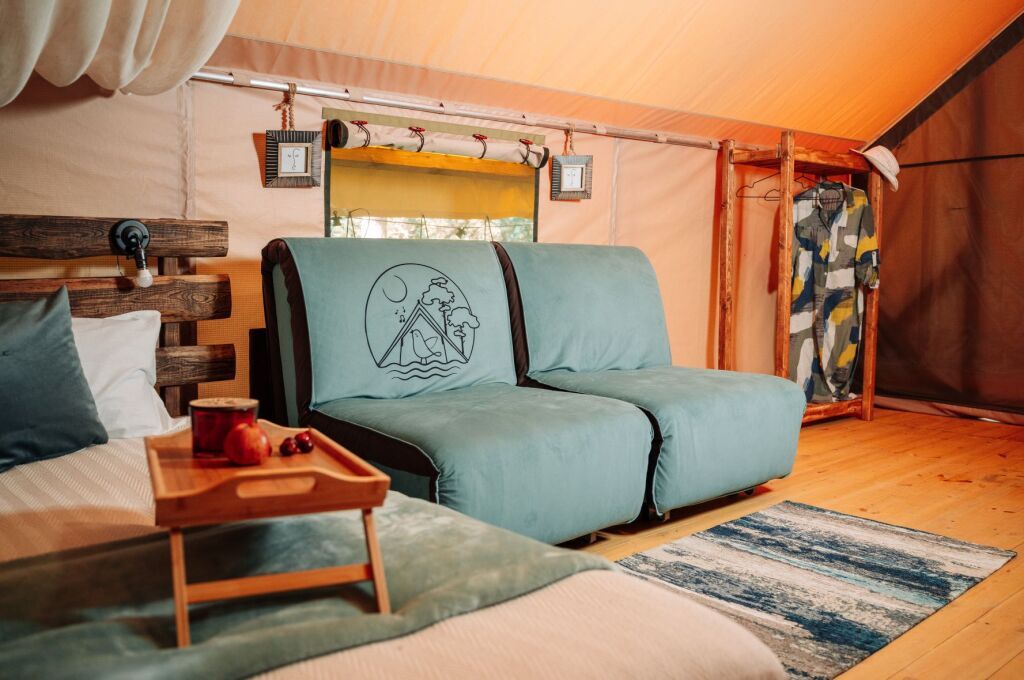 Модули глэмпинга оборудованы кухней, санузлом, просторной террасой с уличной мебелью и мангальной зоной. На территории имеется кафе домашней кухни, где можно выпить кофе и травяной чай, также на территории кафе имеется Wi-Fi.