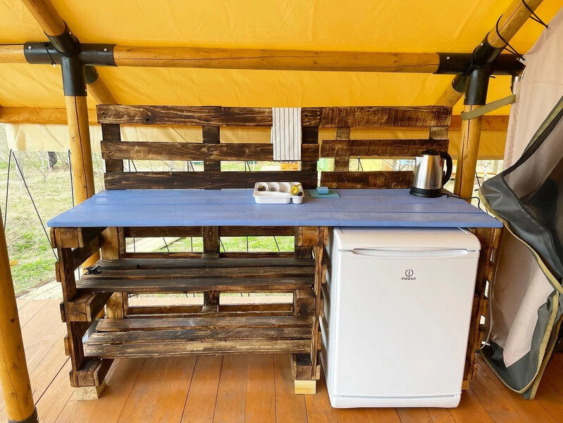Санузел на территории, мангальная зона, электропростыни, отопление палатки, кухонный уголок с холодильником и чайником.