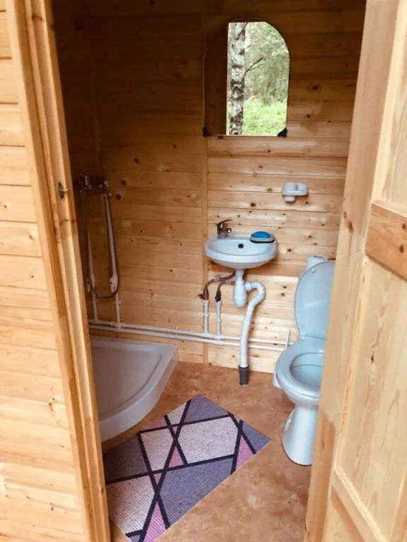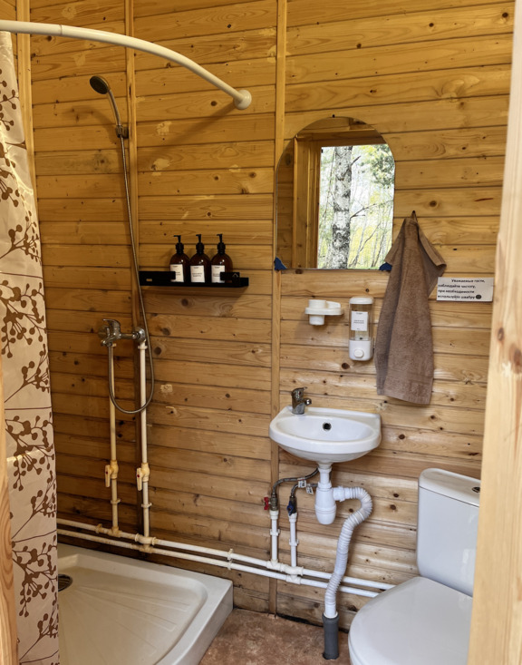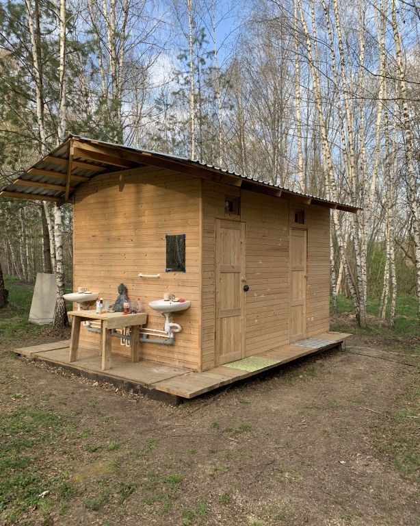 Удобства общие: раковины (с зеркалами) и душевые кабинки (4 шт.), все с горячей водой, 4 основных санузла с септиком