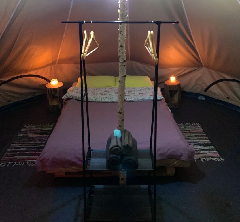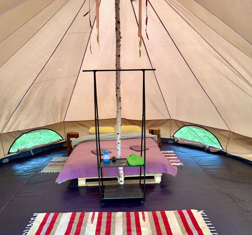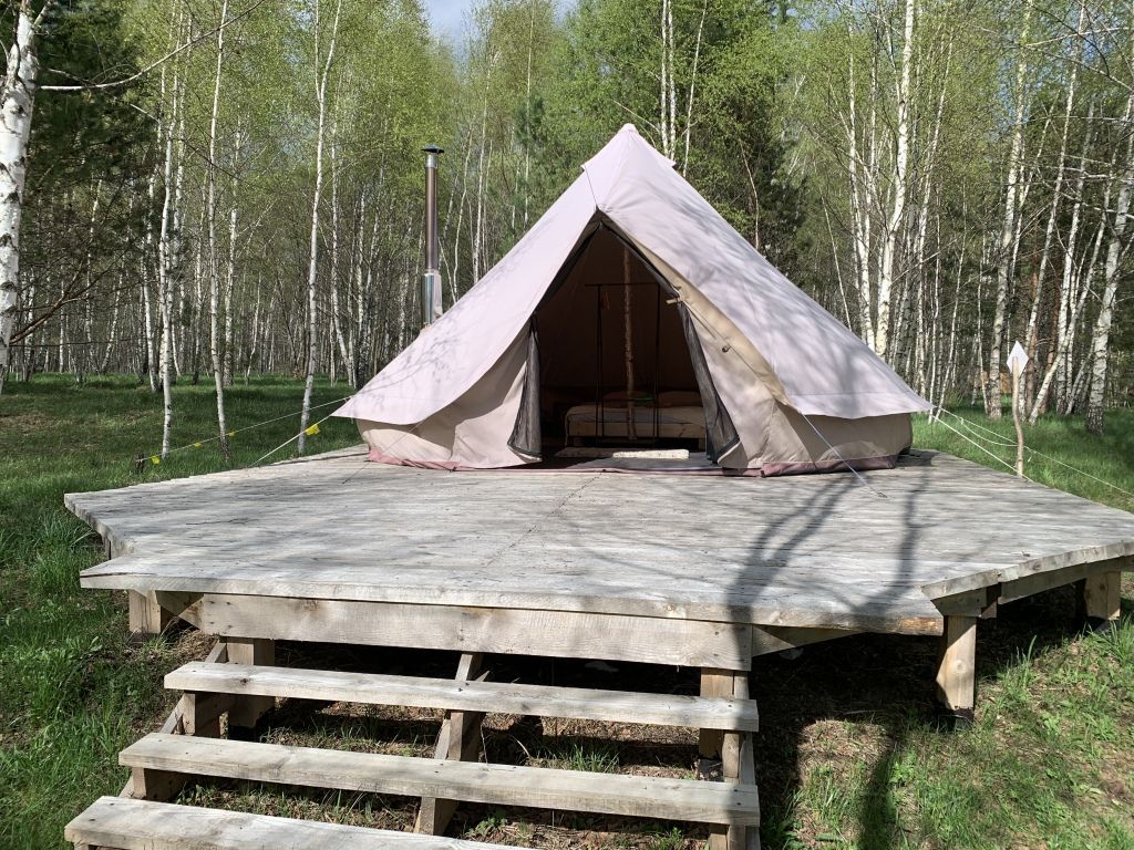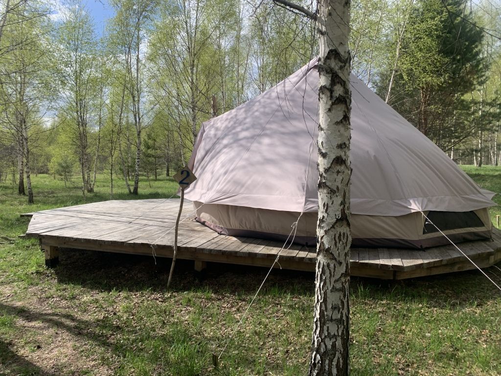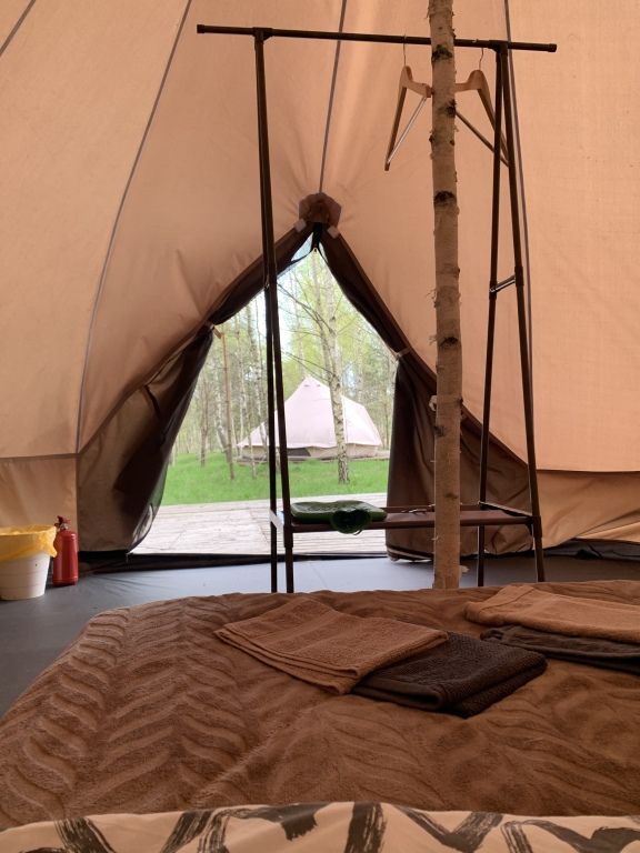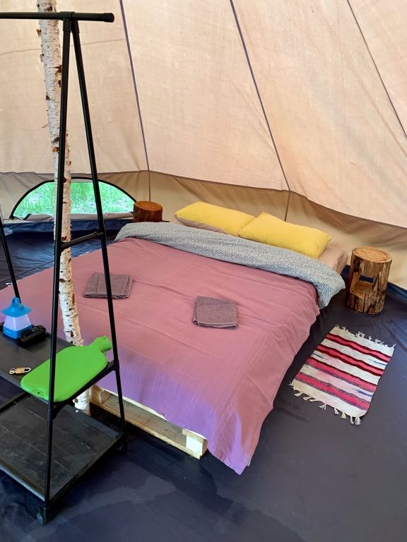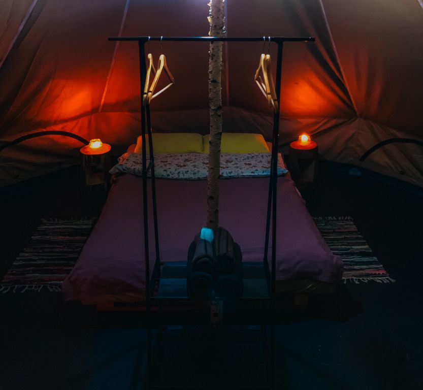 Каждый шатер оснащен кроватью для двоих + есть возможность поставить 1-2 спальных места, т.е макс. количество спальных мест в шатре — 4.