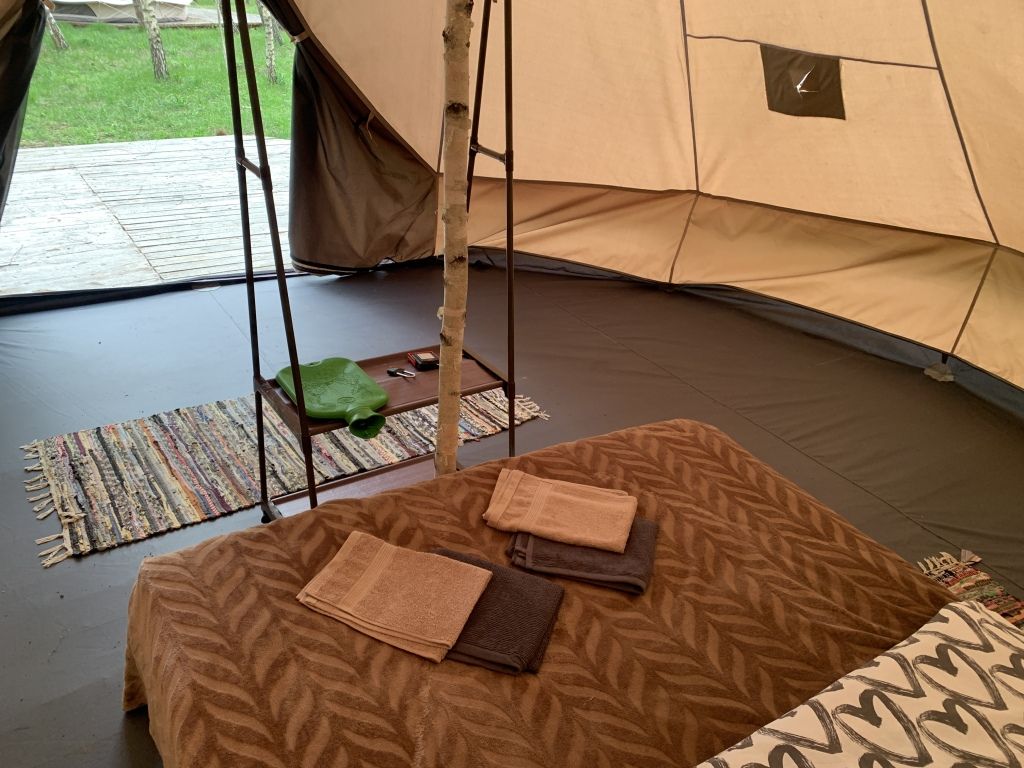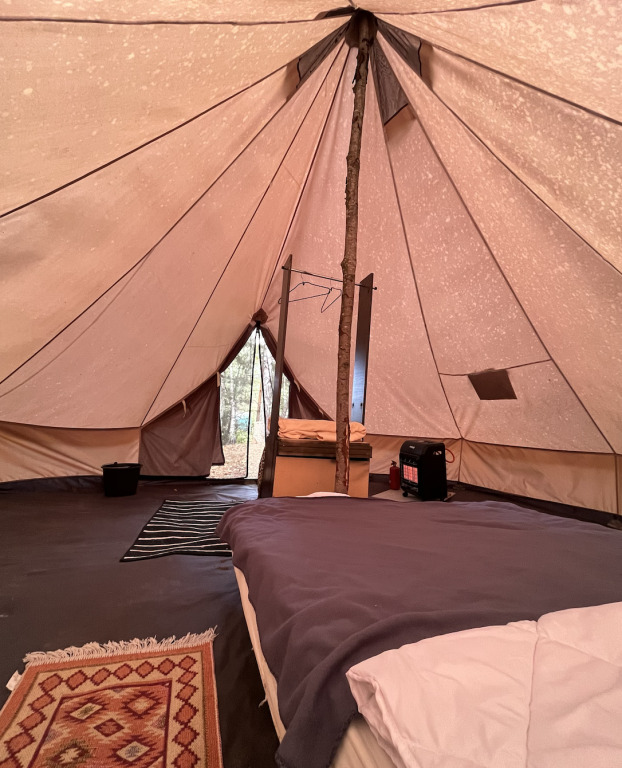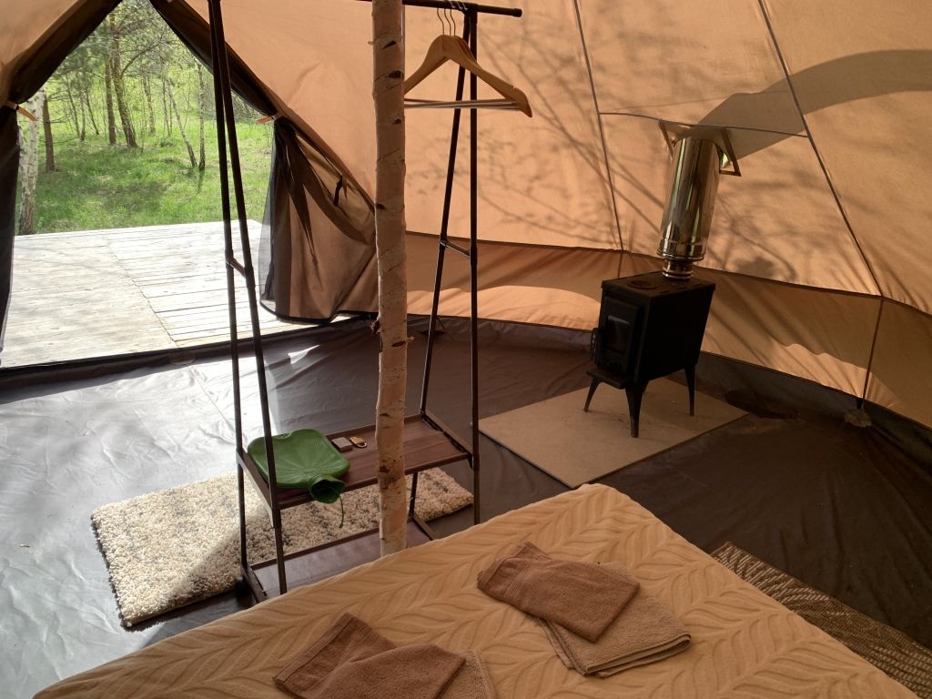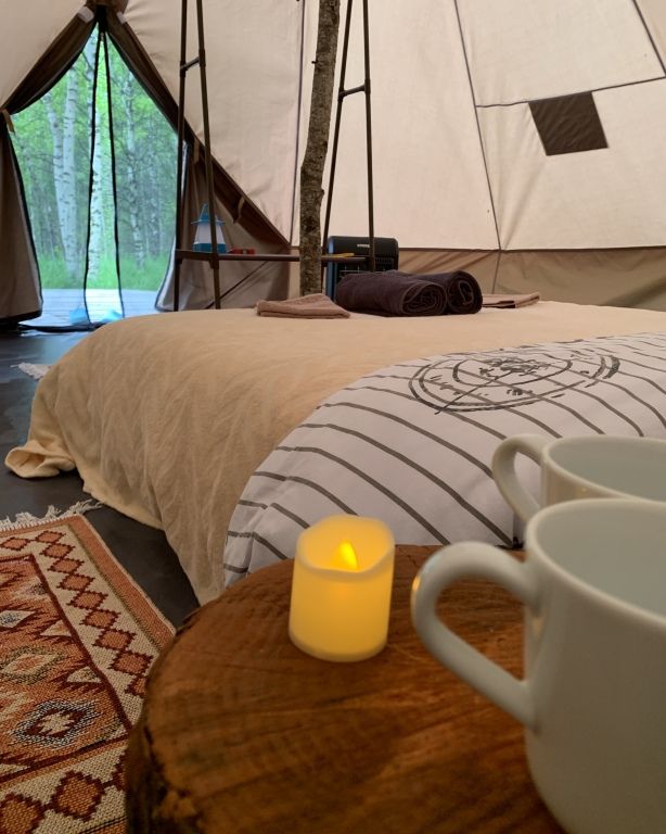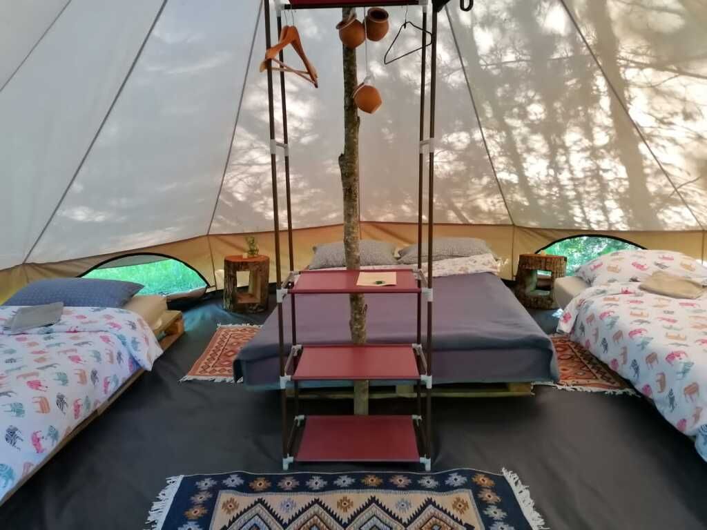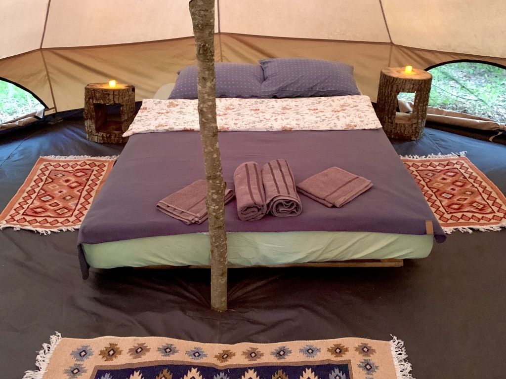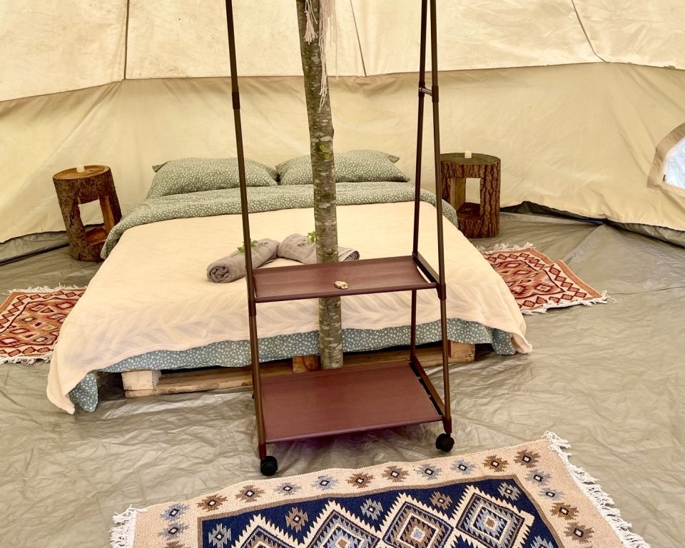 Каждый шатер оснащен кроватью для двоих + есть возможность поставить 1-2 спальных места, т.е макс. количество спальных мест в шатре — 4.