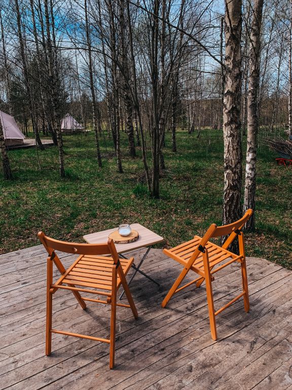 В шатре: кровать 140 см, 2 прикроватные тумбочки, вешалка, столик и 2 стула.