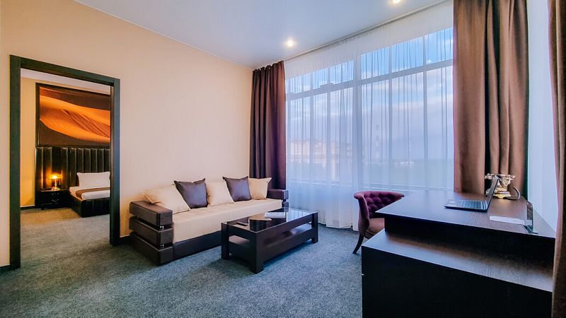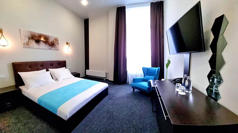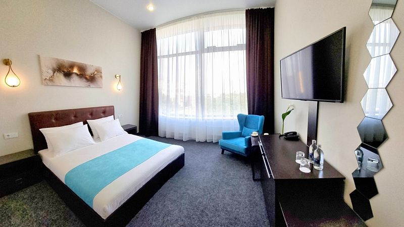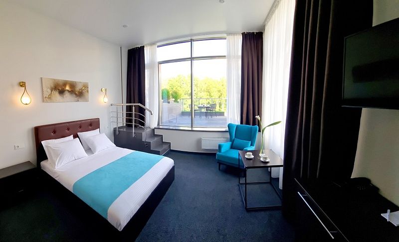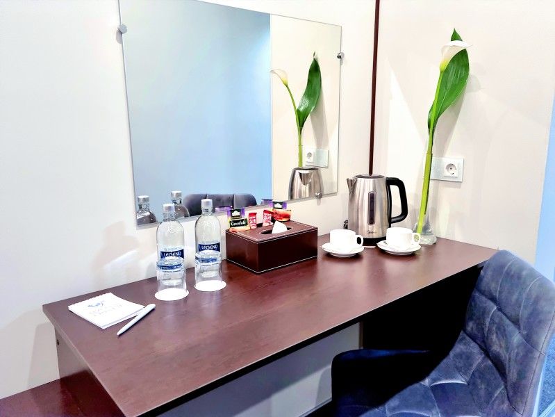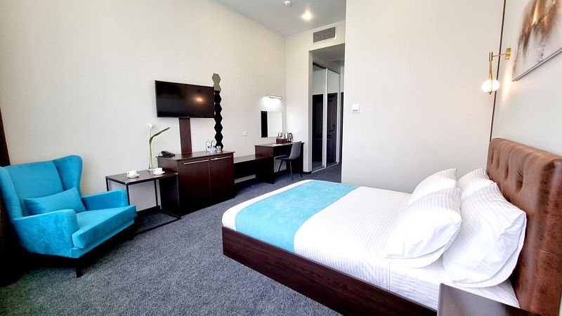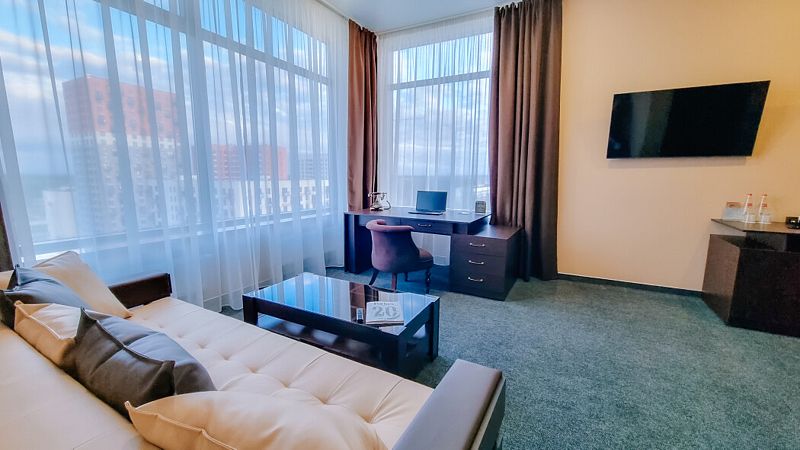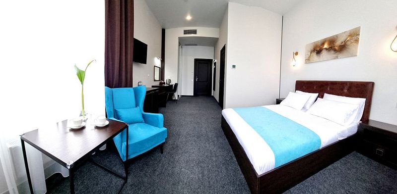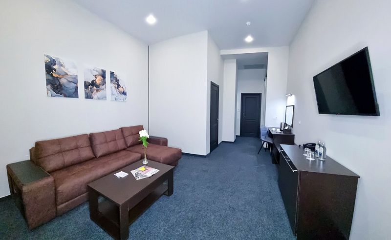 Современный дизайн и наполнение номера необходимыми элементами интерьера располагают как к плодотворной работе, так и к спокойному отдыху.
