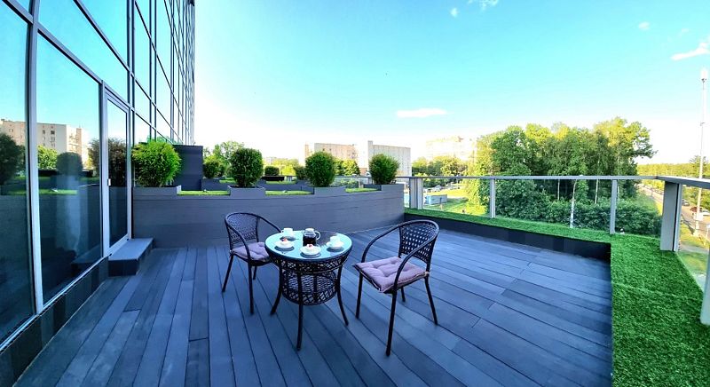 Площадь веранды 25 кв. м. Вас порадует возможность отдыхать и работать не только в номере, но и на открытом воздухе с панорамными пейзажами за окном.