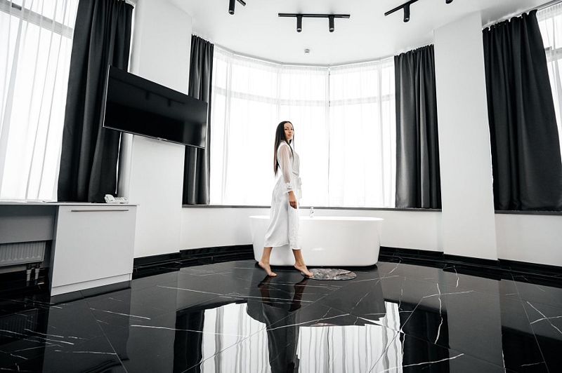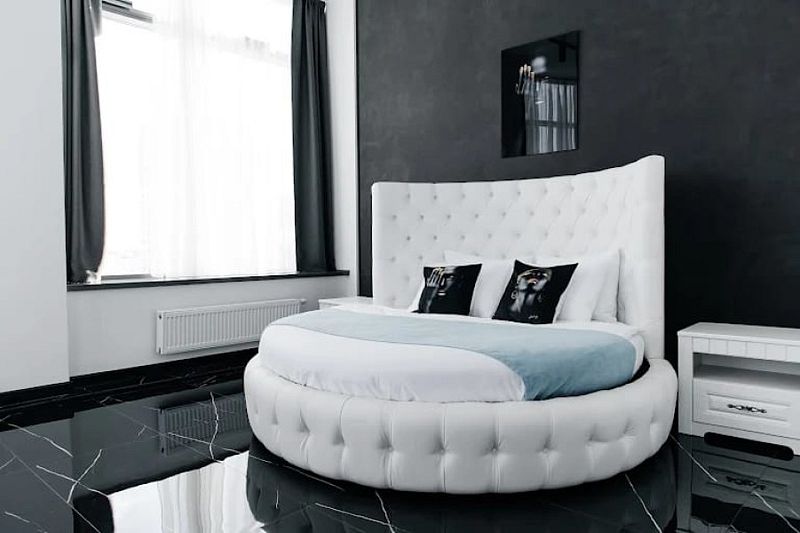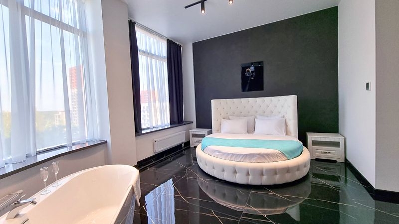 Неповторимый элегантный номер в черно-белых тонах не оставит Вас равнодушными. Закругленное панорамное остекление с прекрасным видом на город и стильная круглая кровать порадует и удивит Вас.