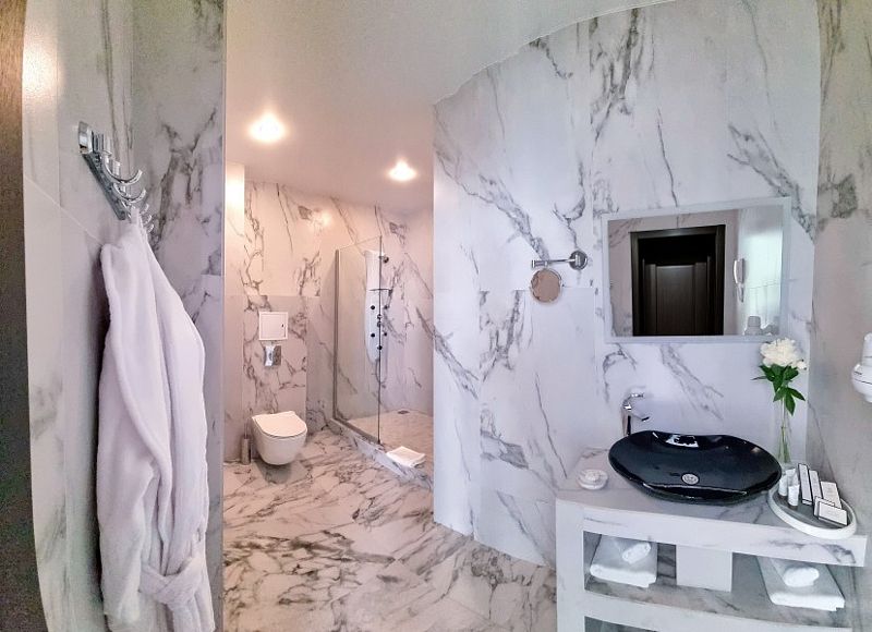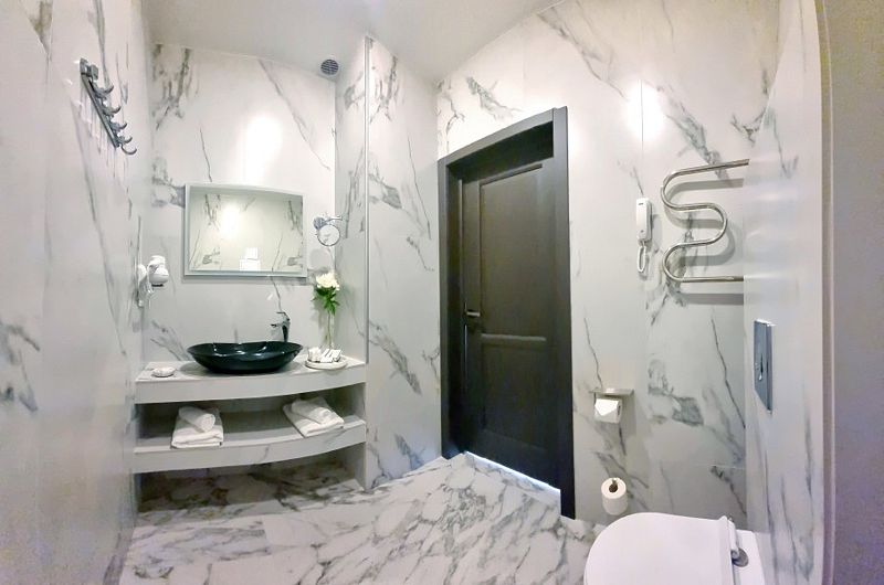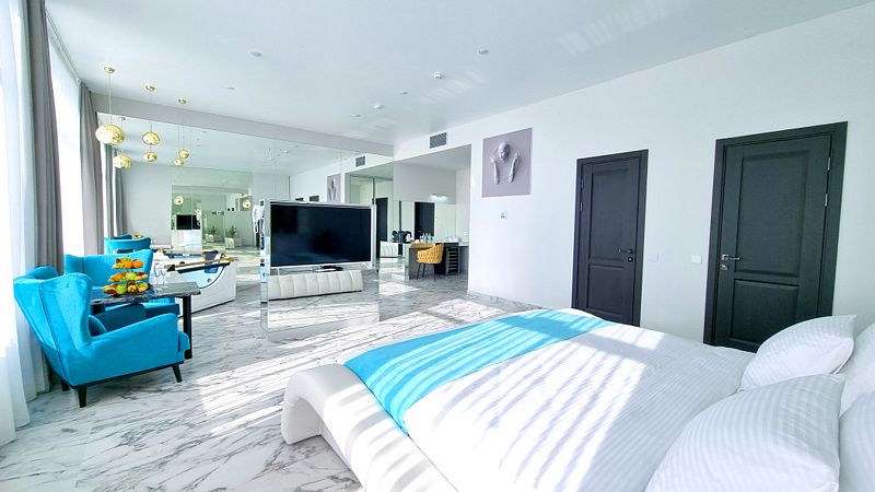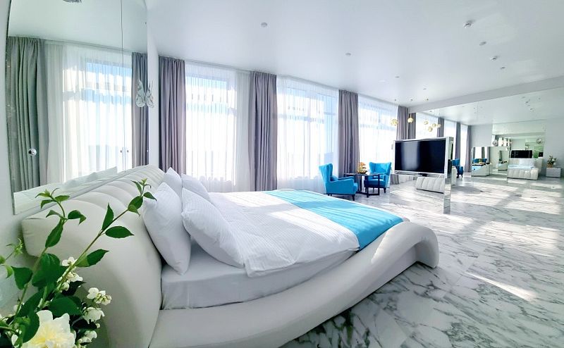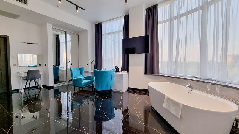 Дизайнерский номер площадью более 60 кв. м. с панорамным видом на город подойдет для ценителей свободы и комфорта. В дизайне интерьера использовалось большое количество зеркал и гранита, что делает этот номер многогранным и безграничным.