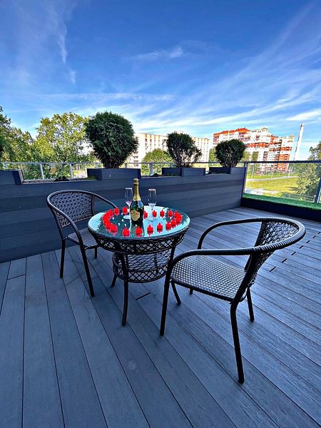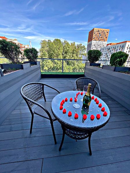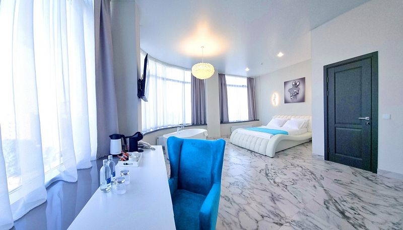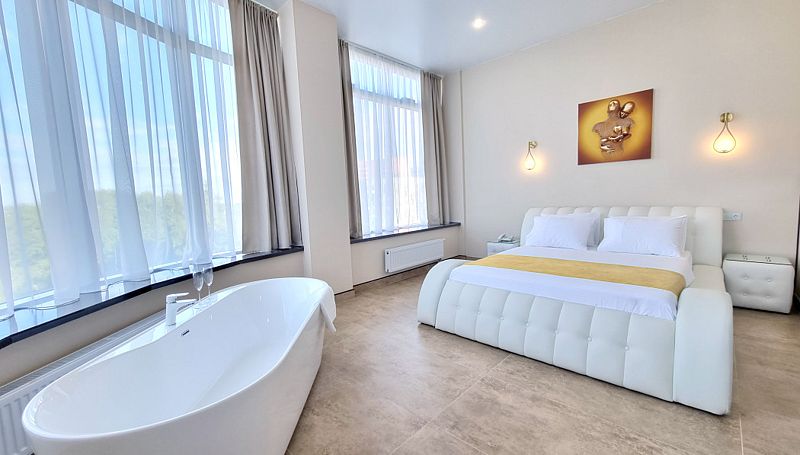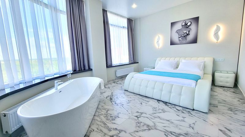 Стильная кровать шириной в два метра, джакузи с видом на город, чашечка ароматного напитка из кофе-машины дадут возможность расслабиться и отдохнуть от городского шума и суеты.