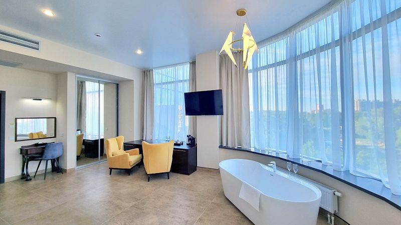 Эксклюзивный номер с закругленным панорамным остеклением удивит и порадует любителей смелых решений. Стильная большая кровать и ванна у окон с видом на город не оставит Вас равнодушным. Прекрасный выбор для романтической встречи или рабочей поездки.