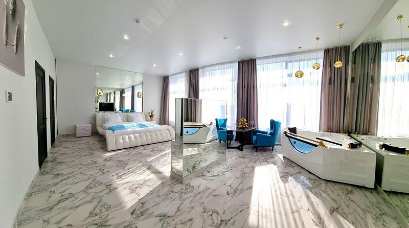 Дизайнерская круглая кровать в окружение зеркал и панорамных окон, откуда виден интересный городской ландшафт, не оставит Вас равнодушным. Отдых в номере со спа-зоной внутри подарит яркие впечатления и окунет Вас в безмятежный отдых и релакс.