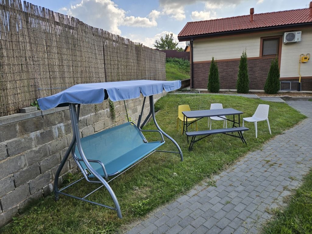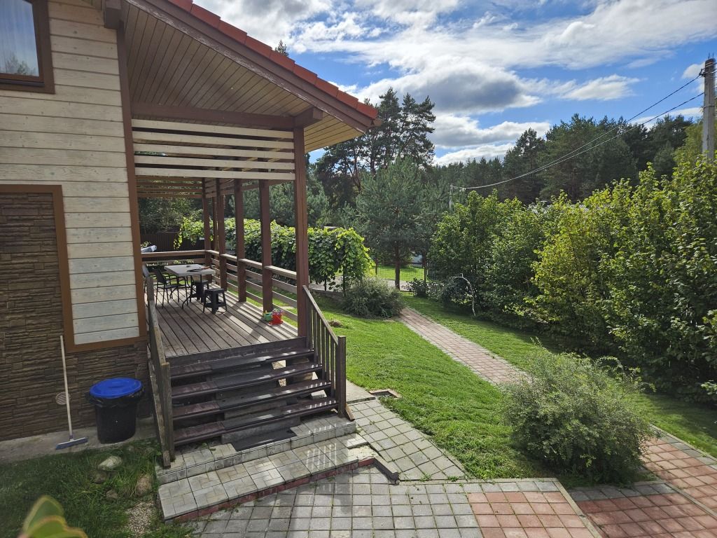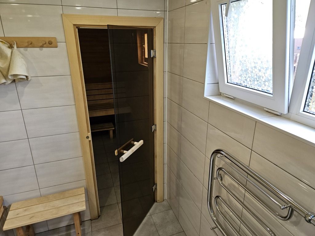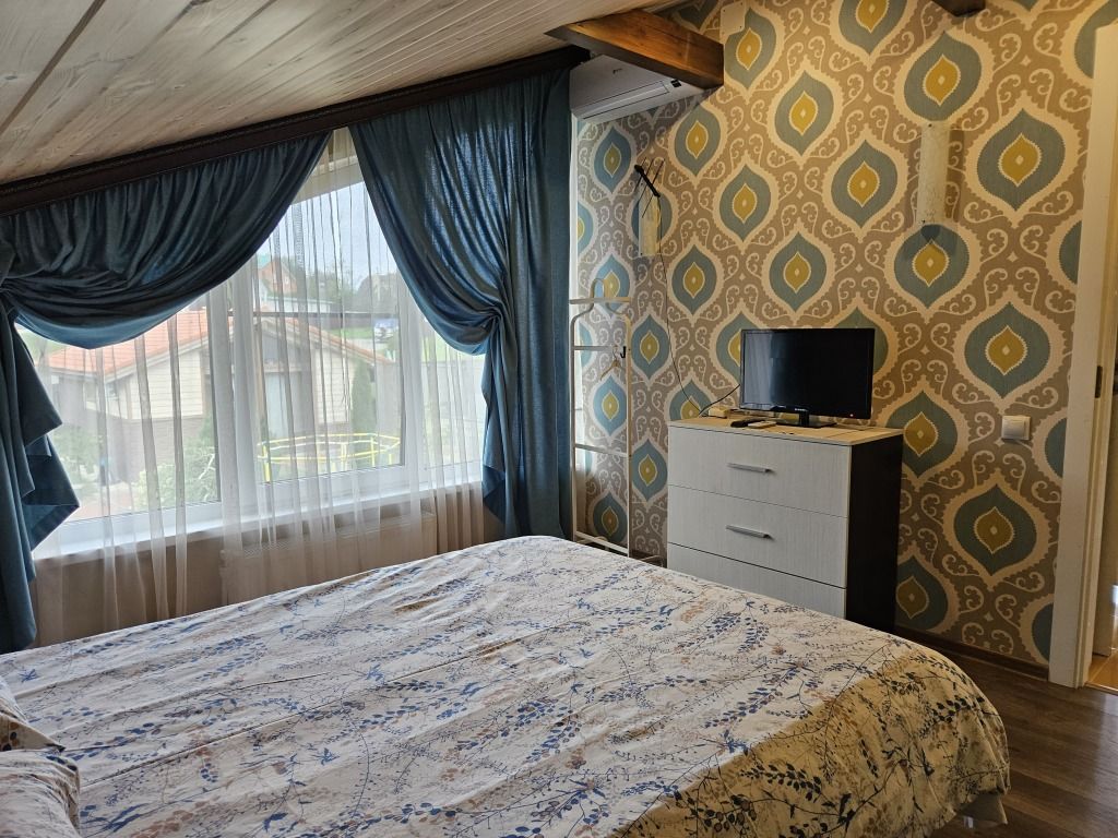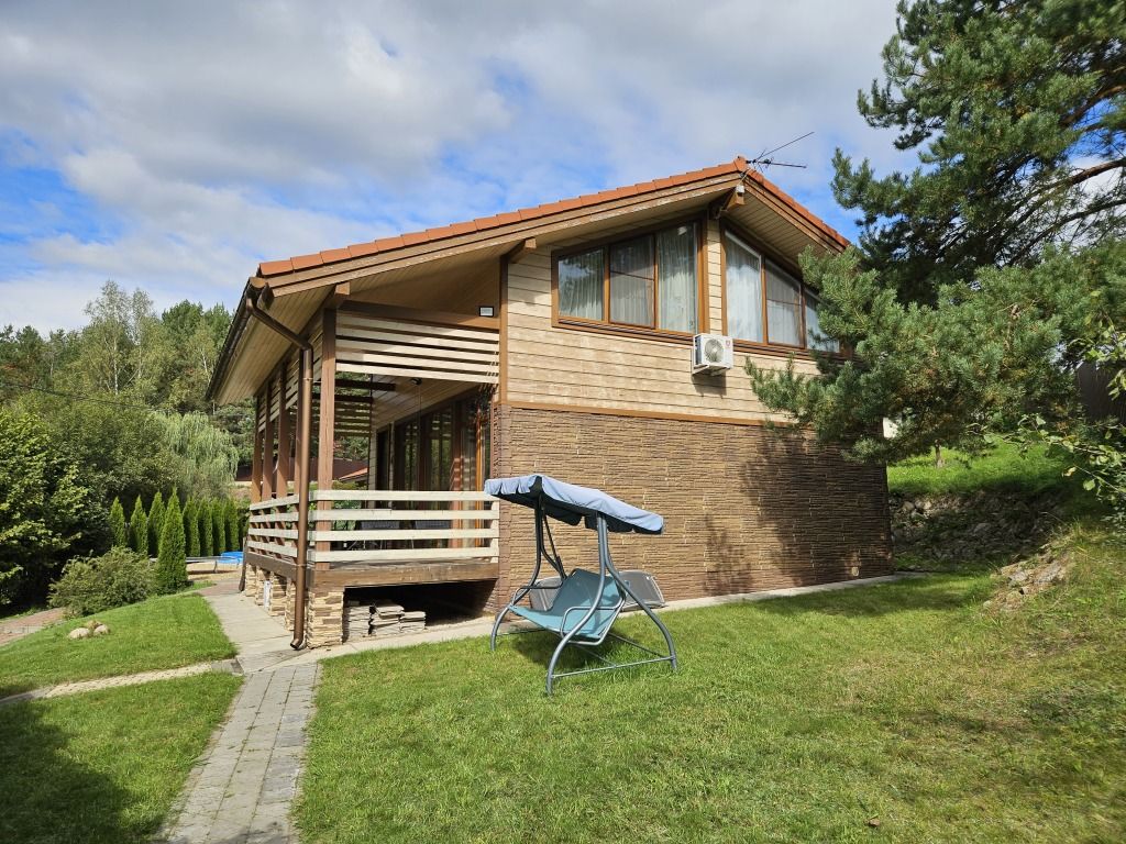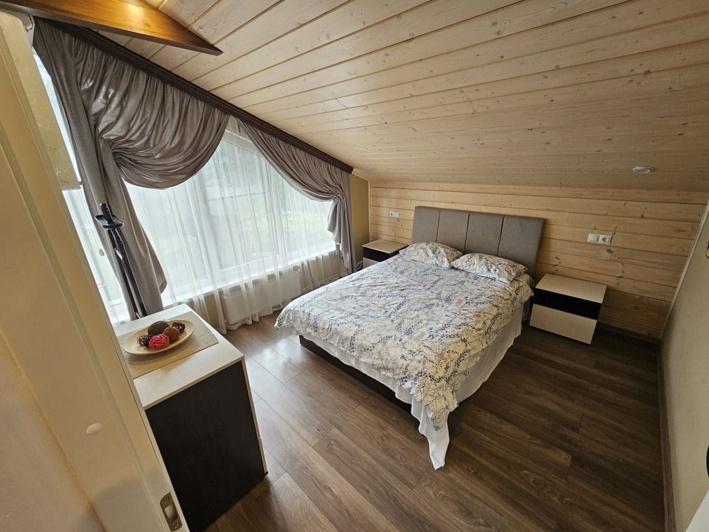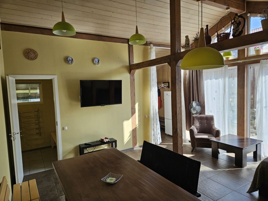 Современное техническое оснащение, в том числе плоский телевизор 48 дюймов. В качестве двух спальных мест используется удобный диван-кровать и современная раскладушка. Свежий и оригинальный интерьер выделяется на фоне классических невзрачных гостевых домов. В сауне установлена финская печь Harvia, в качестве камней используется «малиновый кварцит».
