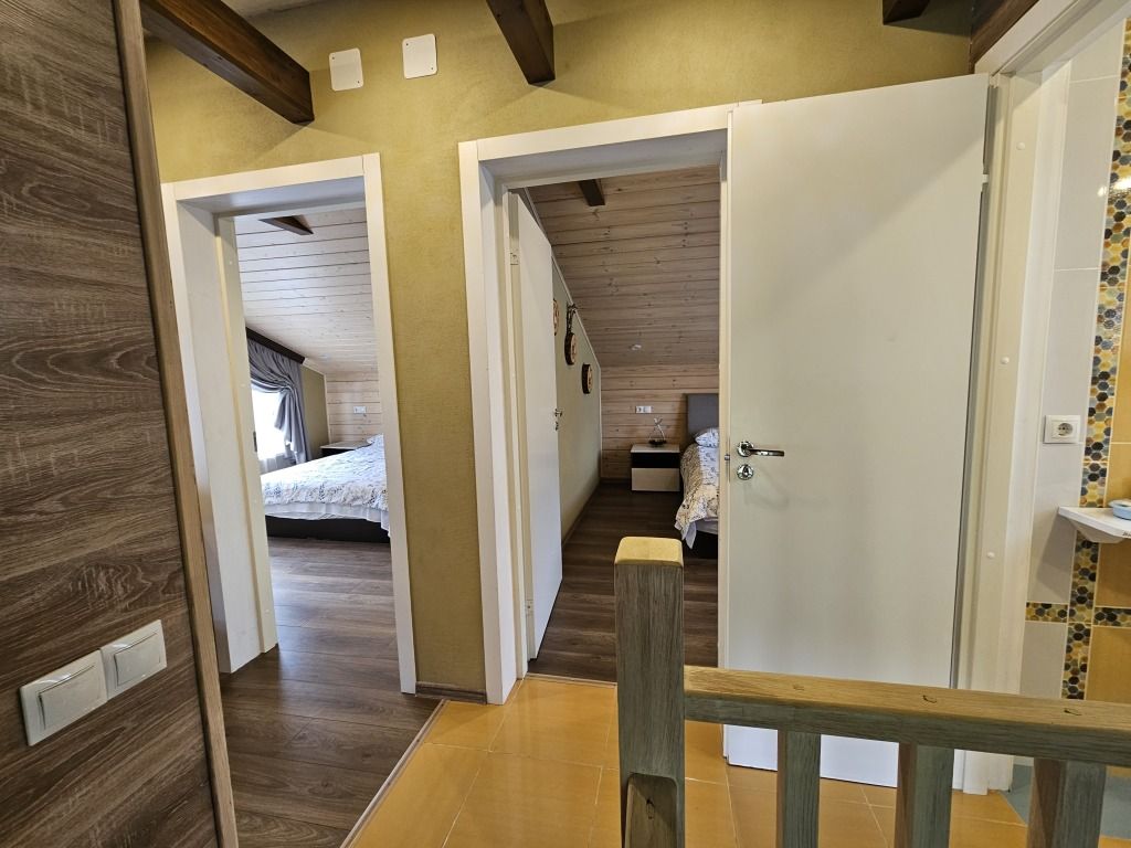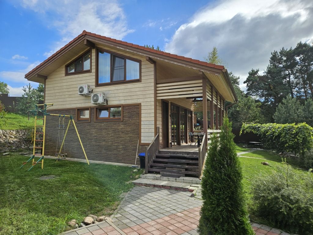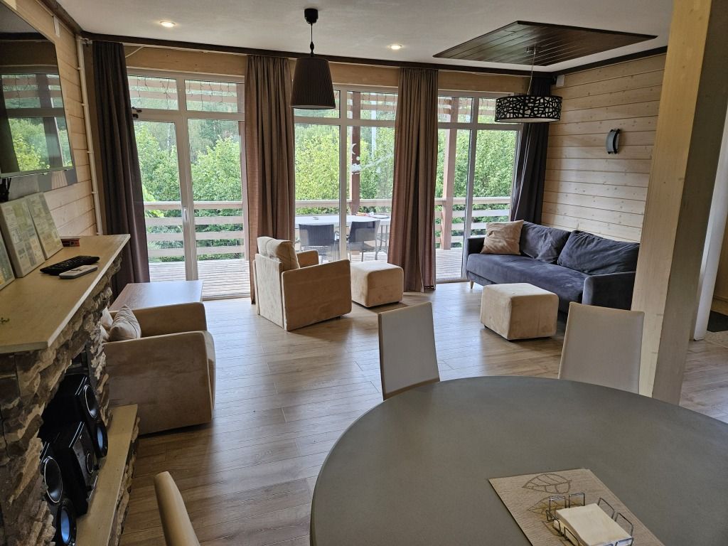 На первом этаже прихожая, гостиная-кухня, с/у. На втором две спальни, комната отдыха и с/у с душевой. Спальни с большими кроватями, дополнительные места (раскладывается диван). Интерьер и экстерьер дома выполнен в оригинальном стиле, который разработан с целью создать комфортную зону для отдыха и релаксации. Главные отличительные особенности: панорамное остекление, много света, экологичные материалы, современное техническое оснащение. Из гостиной предусмотрен выход на террасу, она выполнена из массива лиственницы.